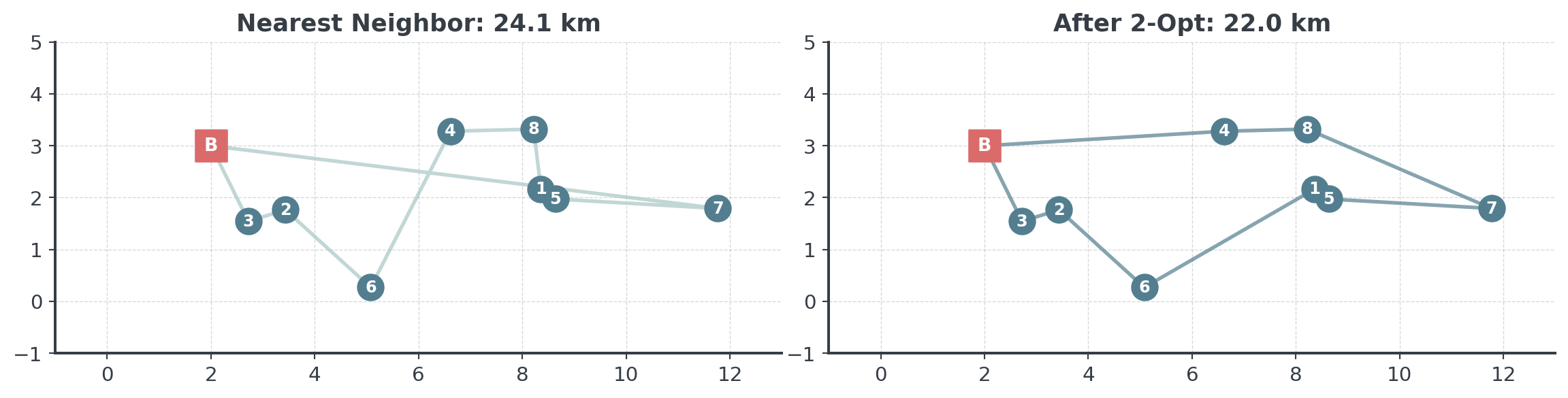 | Have minutes | Multi-start + 2-opt | Explore more options |
