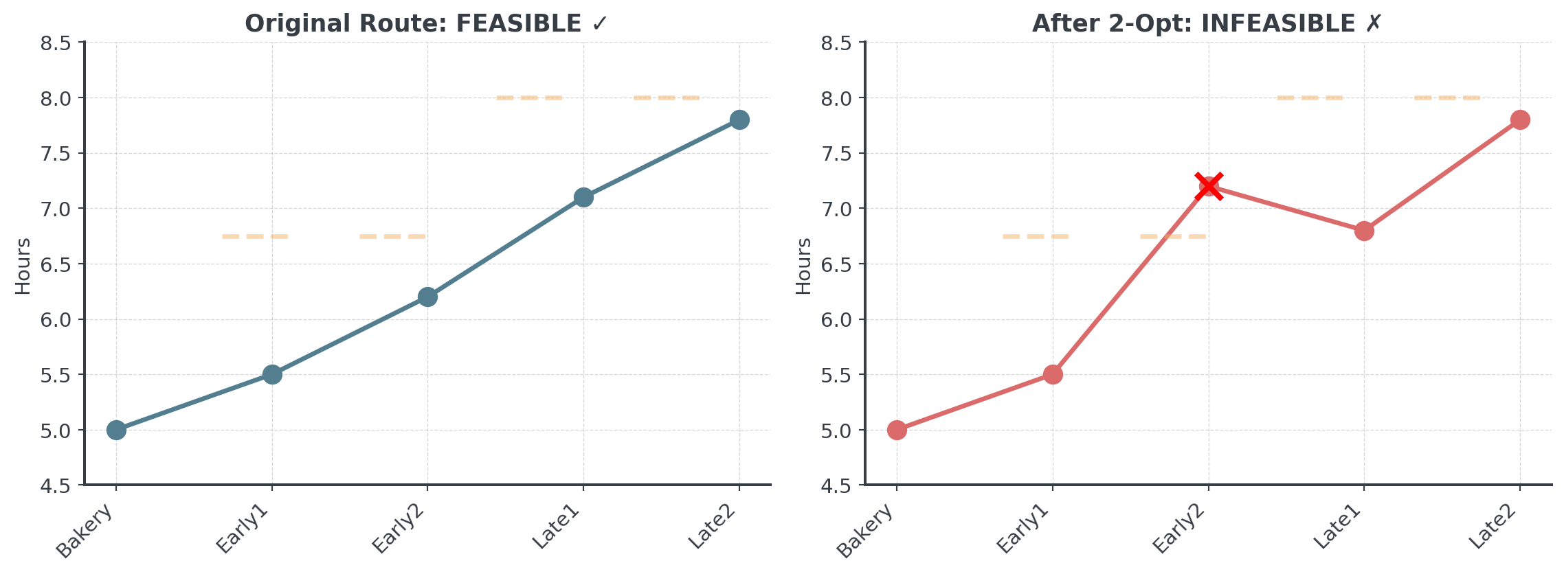 current_time += travel_time(current, next_stop) + service_time2-Opt with Time Windows