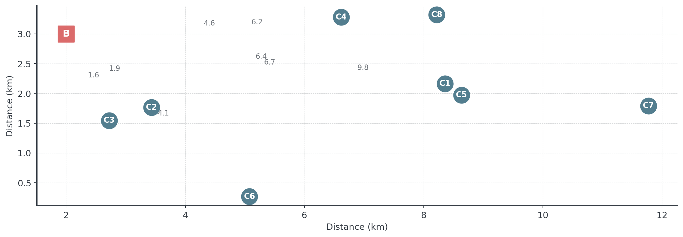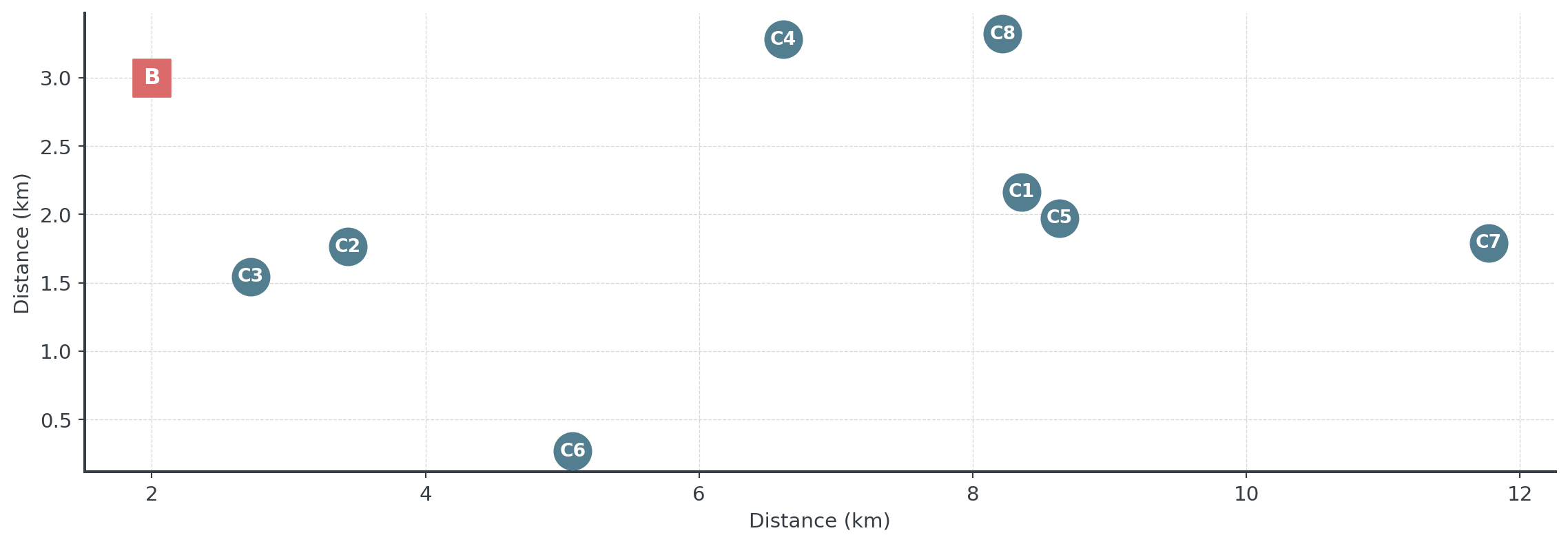 - Time Windows: 3 cafés open early (6:30) and need priority