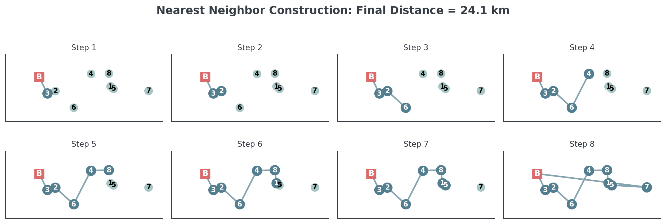 | Time windows | NN (early) + Or-opt | Preserves feasibility |