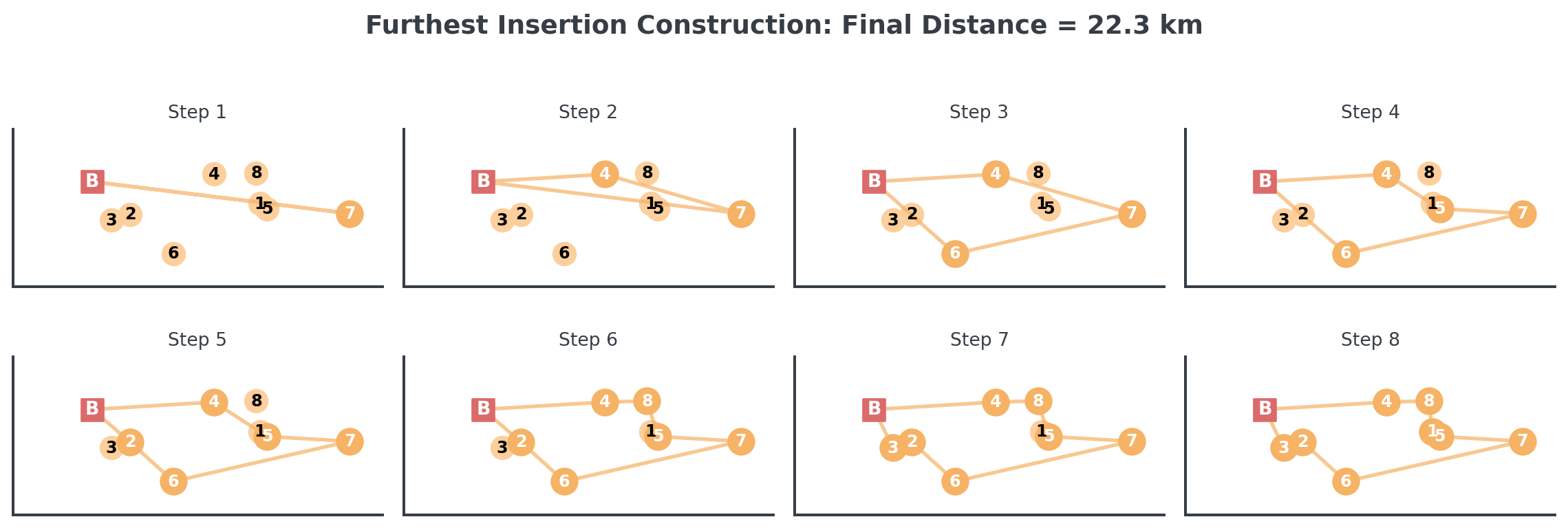 Farthest insertion builds a more balanced tour by establishing the outer structure first!