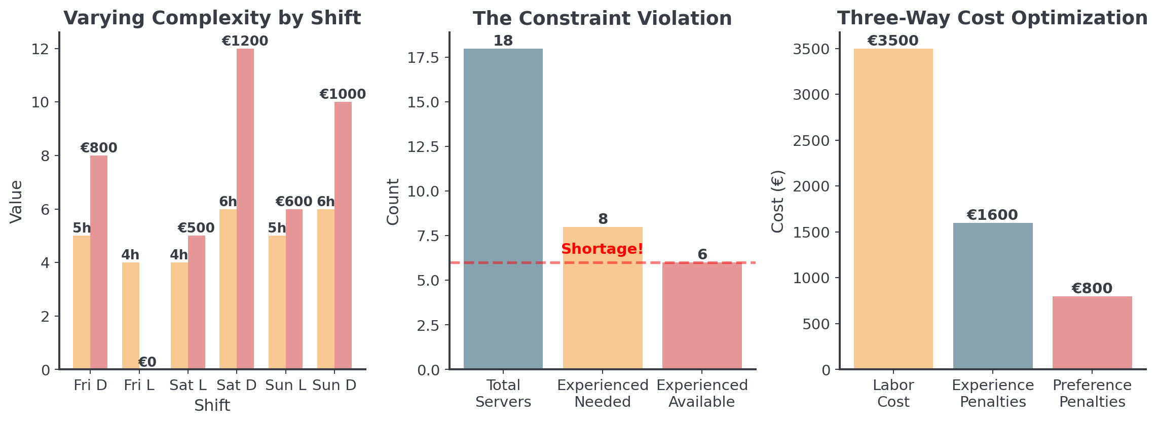“I need to schedule my 18 servers across 6 shifts this weekend. Shifts have different lengths (4-6 hours), and if I don’t have enough experienced servers on busy shifts, we face penalties per missing experienced server from our parent company!”