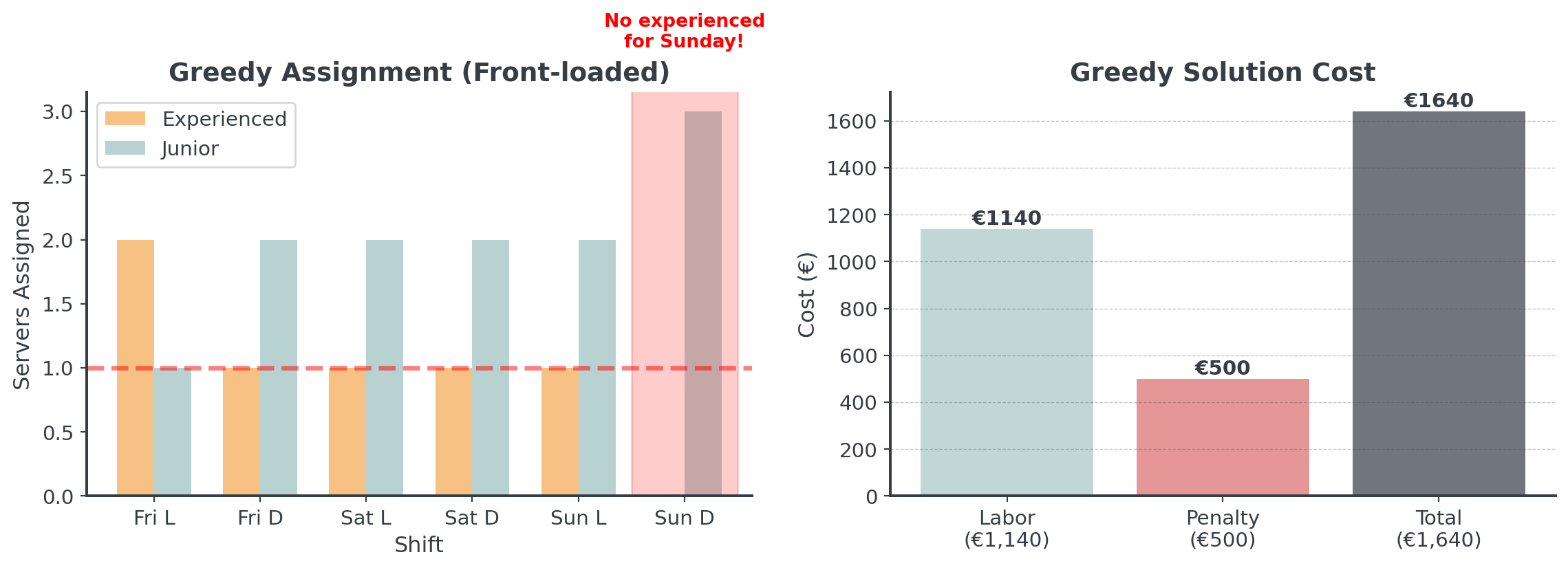 - 18 servers available (6 experienced @ €75/hr, 12 junior @ €25/hr)