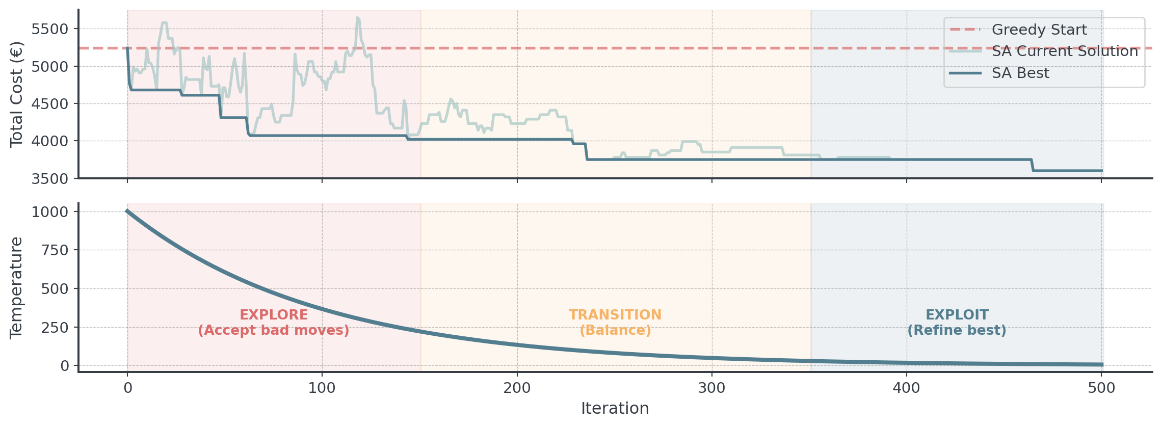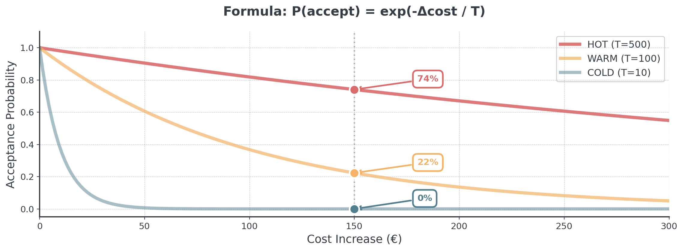 We essentially compare the cost of the new schedule to the current cost and decide whether to accept the change based on the temperature and the difference in cost.