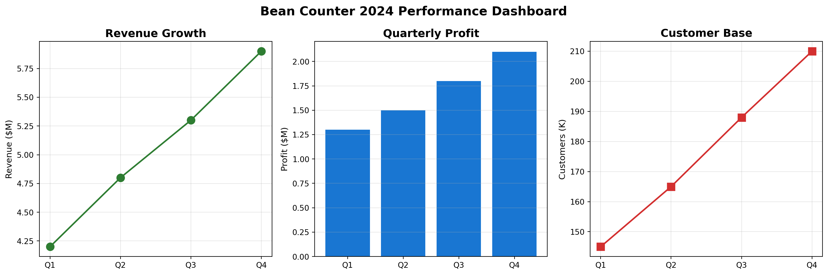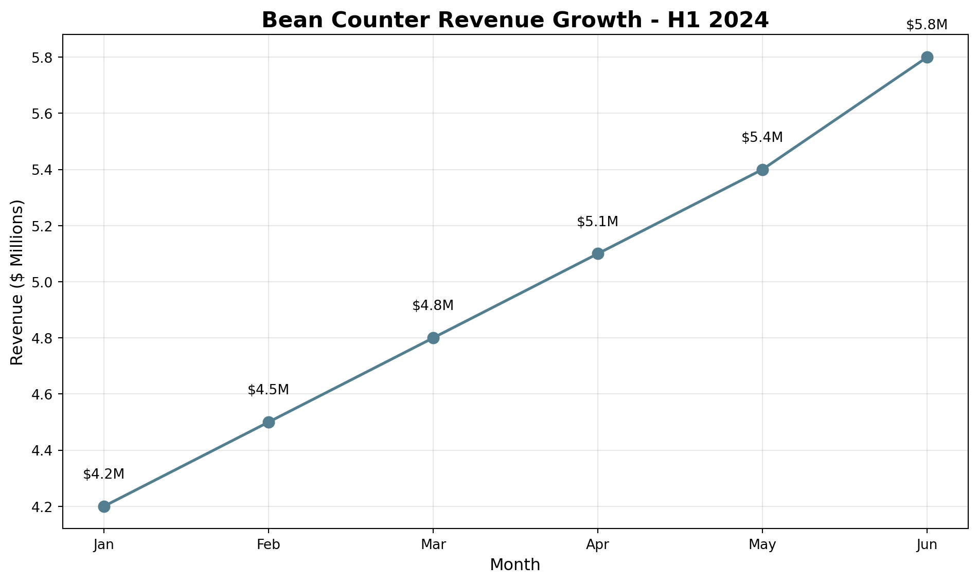import pandas as pdimport matplotlib.pyplot as plt# Monthly revenue trendmonths = ['Jan', 'Feb', 'Mar', 'Apr', 'May', 'Jun']revenue = [4.2, 4.5, 4.8, 5.1, 5.4, 5.8]plt.figure(figsize=(10, 6))plt.plot(months, revenue, marker='o', linewidth=2, markersize=8, color='#537E8F')plt.title('Bean Counter Revenue Growth - H1 2024', fontsize=16, fontweight='bold')plt.xlabel('Month', fontsize=12)plt.ylabel('Revenue ($ Millions)', fontsize=12)plt.grid(True, alpha=0.3)# Add value labelsfor i, v inenumerate(revenue): plt.text(i, v +0.1, f'${v}M', ha='center')plt.tight_layout()plt.show()