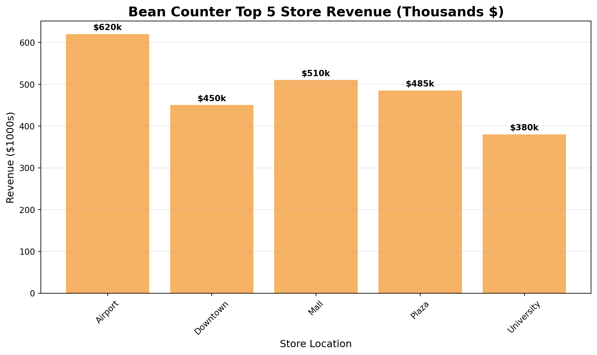 import pandas as pdimport numpy as npimport matplotlib.pyplot as plt# Top 5 store performancestores = ['Airport', 'Downtown', 'Mall', 'Plaza', 'University']revenue = [620, 450, 510, 485, 380]# Create bar chartplt.figure(figsize=(10, 6))plt.bar(stores, revenue, color='#F6B265')plt.title('Bean Counter Top 5 Store Revenue (Thousands $)', fontsize=16, fontweight='bold')plt.xlabel('Store Location', fontsize=12)plt.ylabel('Revenue ($1000s)', fontsize=12)plt.grid(axis='y', alpha=0.3)plt.xticks(rotation=45)# Add value labels on barsfor i, v inenumerate(revenue): plt.text(i, v +10, f'${v}k', ha='center', fontweight='bold')plt.tight_layout()plt.show()