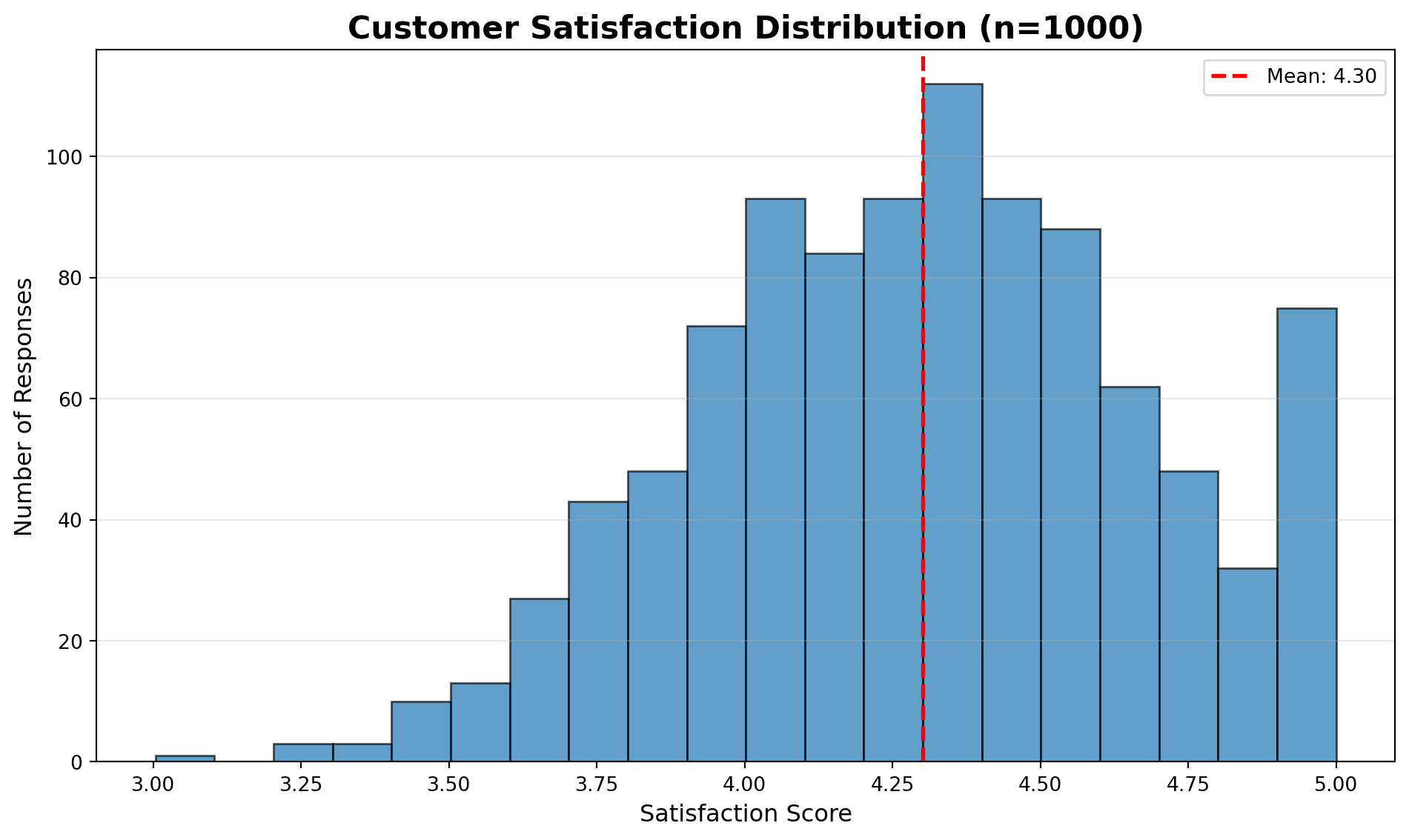 import numpy as npimport matplotlib.pyplot as plt# Simulate customer satisfaction scoresnp.random.seed(42)satisfaction_scores = np.random.normal(4.3, 0.4, 1000)satisfaction_scores = np.clip(satisfaction_scores, 1, 5)plt.figure(figsize=(10, 6))plt.hist(satisfaction_scores, bins=20, alpha=0.7, edgecolor='black')plt.title('Customer Satisfaction Distribution (n=1000)', fontsize=16, fontweight='bold')plt.xlabel('Satisfaction Score', fontsize=12)plt.ylabel('Number of Responses', fontsize=12)plt.axvline(x=satisfaction_scores.mean(), color='red', linestyle='--', linewidth=2, label=f'Mean: {satisfaction_scores.mean():.2f}')plt.legend()plt.grid(axis='y', alpha=0.3)plt.tight_layout()plt.show()