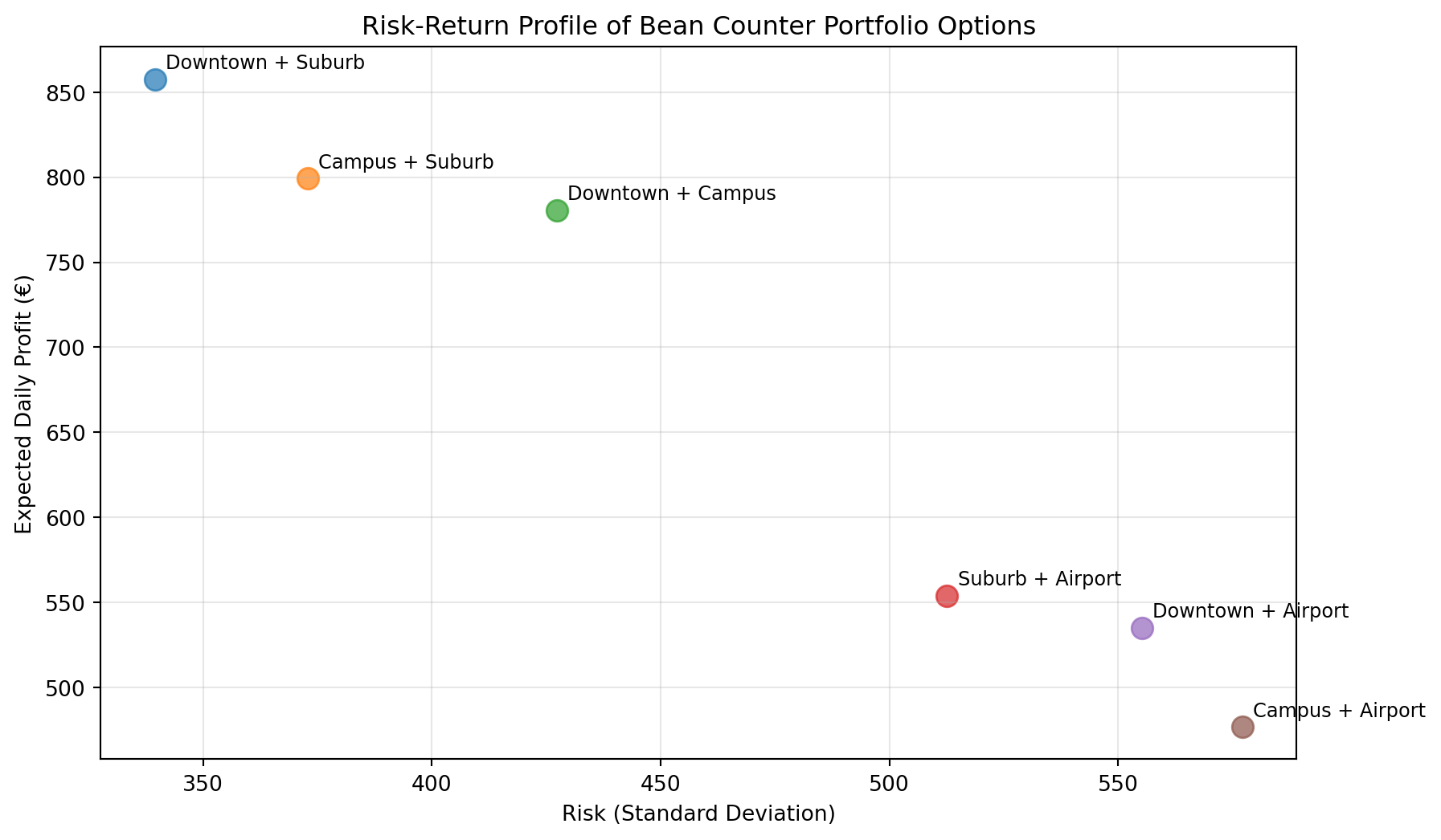 # Don't modify belowassertlen(portfolio_results) ==6, "Should have 6 portfolio combinations"assert'Downtown + Suburb'in best_mean_portfolio or'Suburb + Downtown'in best_mean_portfolio, \f"Best mean portfolio should include Downtown + Suburb, got {best_mean_portfolio}"assert700< best_mean_value <900, f"Best mean should be ~800, got {best_mean_value:.2f}"print("Portfolio analysis correct!")print("\nAll Portfolio Combinations:")print(df_portfolios.to_string(index=False))