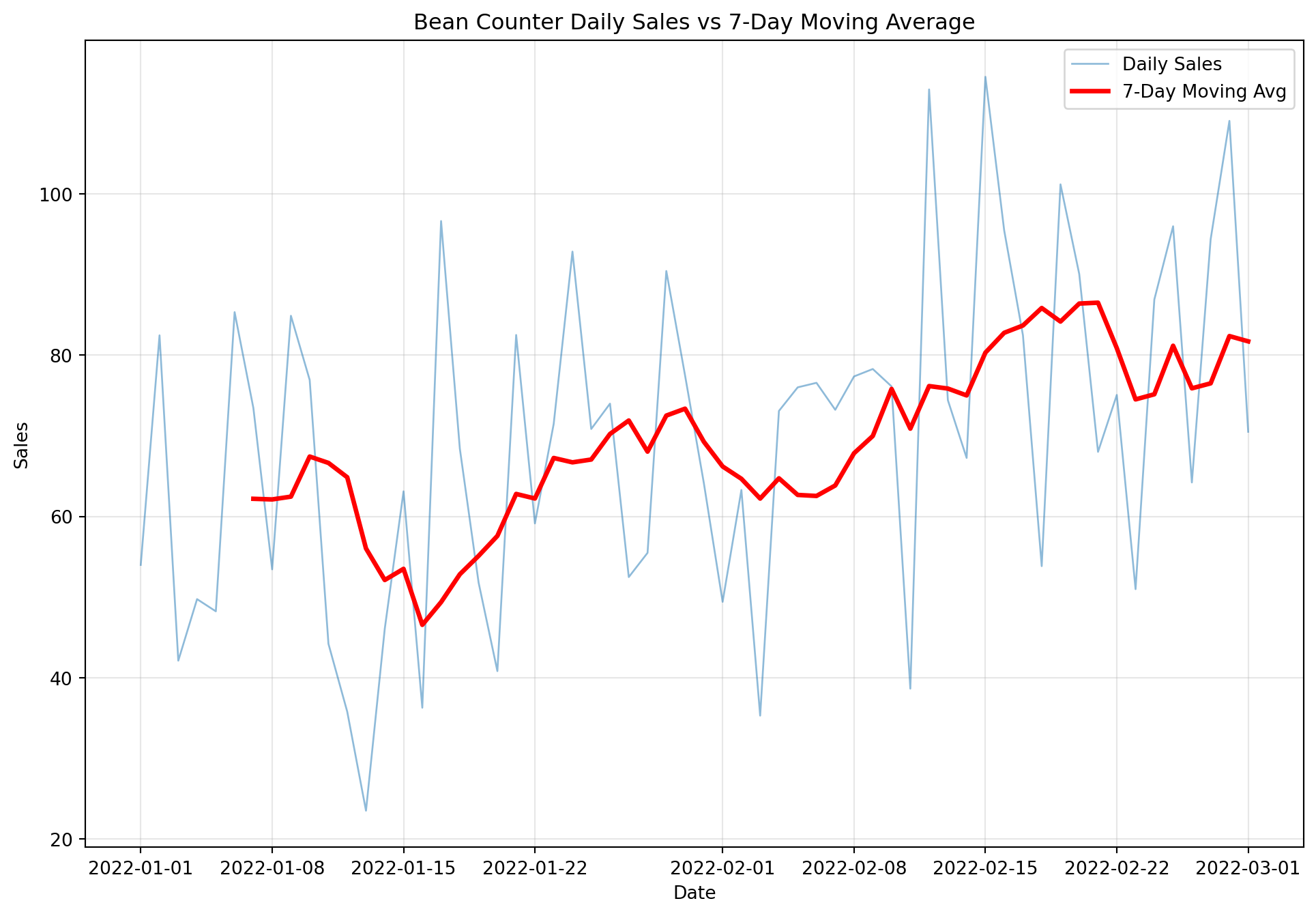 Daily sales are noisy. Moving averages help us see the underlying patterns by averaging nearby data points.