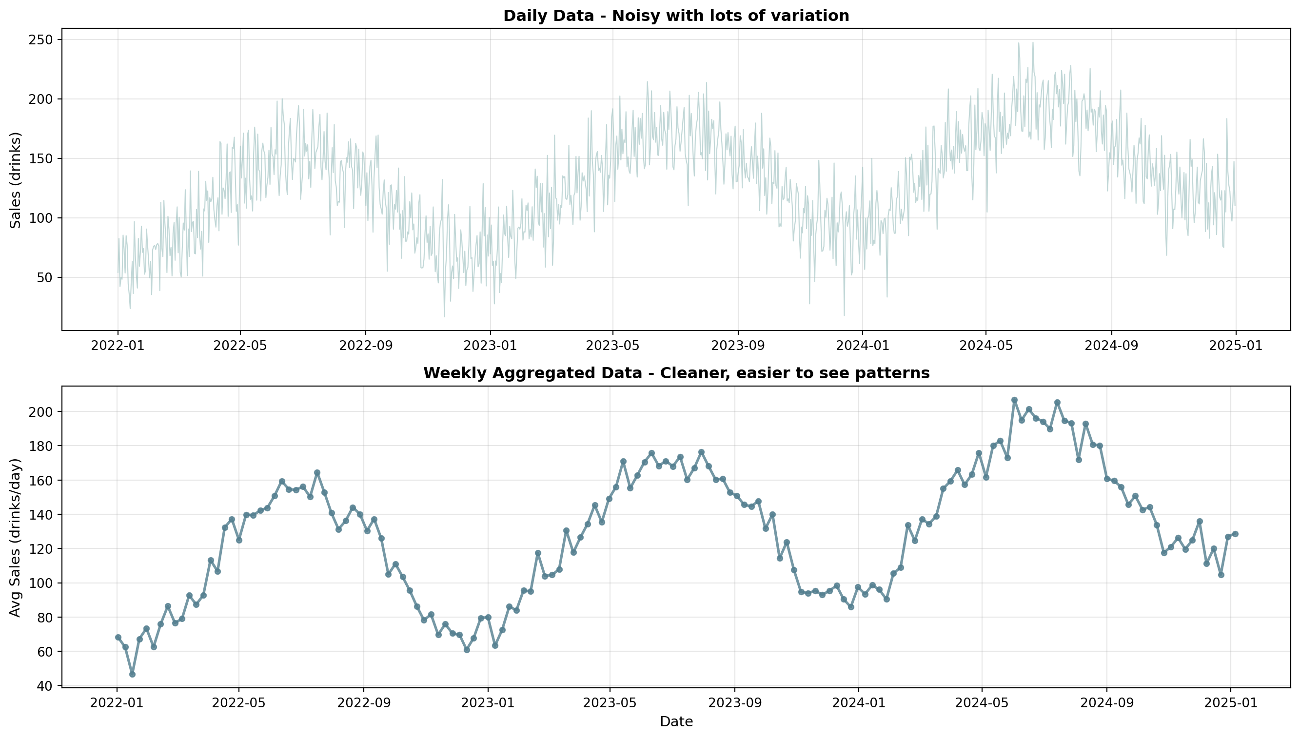 You have 2 years of daily sales data. The board wants accurate forecasts for next month to optimize inventory. Overstock means waste (drinks expire), understock means lost sales and unhappy customers!