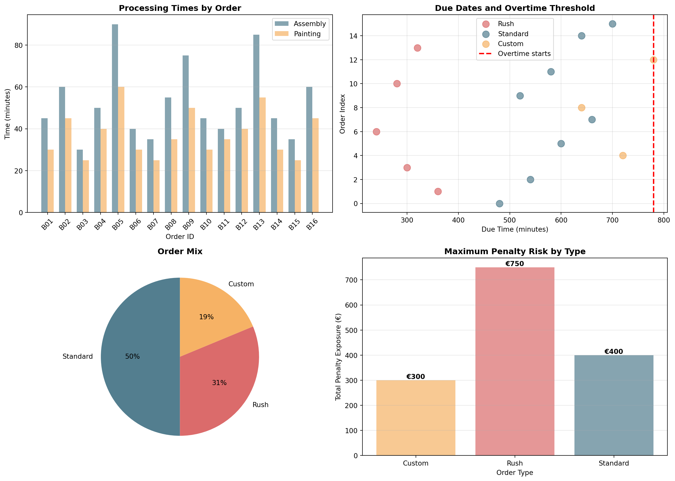 {'id': 'B01', 'type': 'Standard', 'assembly': 45, 'painting': 30, 'due': 480, 'penalty': 50},