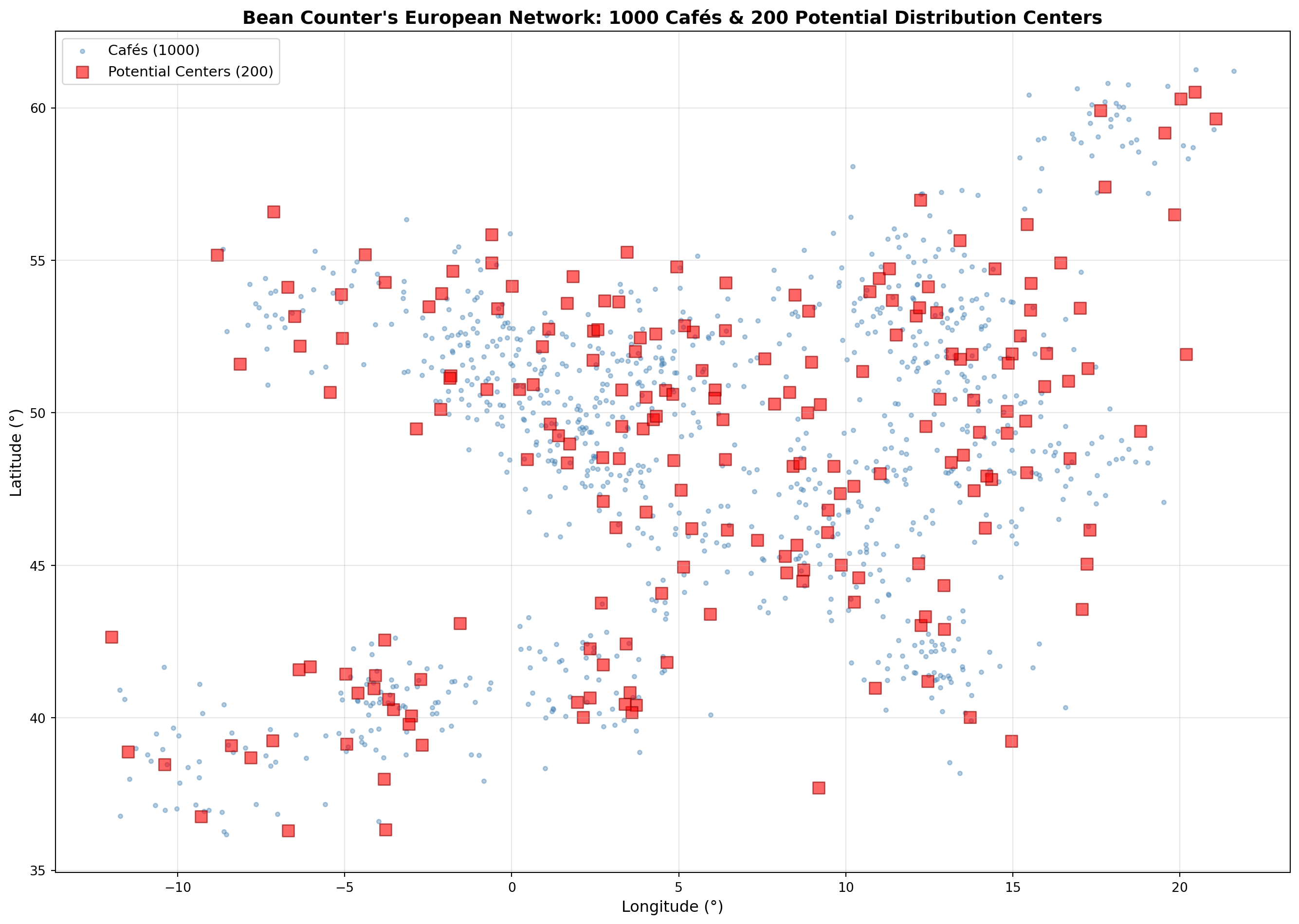 # DON'T CHANGE ANYTHING BELOW# Major European cities (simplified)european_cities = {'London': (51.5074, -0.1278, 120),'Paris': (48.8566, 2.3522, 95),'Berlin': (52.5200, 13.4050, 80),'Madrid': (40.4168, -3.7038, 75),'Rome': (41.9028, 12.4964, 65),'Amsterdam': (52.3676, 4.9041, 55),'Vienna': (48.2082, 16.3738, 50),'Barcelona': (41.3851, 2.1734, 60),'Munich': (48.1351, 11.5820, 45),'Hamburg': (53.5511, 9.9937, 40),'Milan': (45.4642, 9.1900, 55),'Prague': (50.0755, 14.4378, 35),'Brussels': (50.8503, 4.3517, 45),'Zurich': (47.3769, 8.5417, 40),'Copenhagen': (55.6761, 12.5683, 35),'Stockholm': (59.3293, 18.0686, 38),'Dublin': (53.3498, -6.2603, 32),'Lyon': (45.7640, 4.8357, 30),'Manchester': (53.4808, -2.2426, 28),'Lisbon': (38.7223, -9.1393, 42)}def generate_cafe_locations(cities_dict, total_cafes=1000):"""Generate café locations clustered around major European cities.""" cafes = [] cities_list =list(cities_dict.items())# Distribute cafés proportionally to city size total_weight =sum(weight for _, (_, _, weight) in cities_list)for city_name, (lat, lon, weight) in cities_list:# Number of cafés in this city's region n_cafes =int(total_cafes * weight / total_weight)# Generate cafés with some spread around city centerfor _ inrange(n_cafes):# Add random offset cafe_lat = lat + np.random.normal(0, 1.2) cafe_lon = lon + np.random.normal(0, 1.4) cafes.append((cafe_lat, cafe_lon))# Fill remaining cafés to reach exactly 1000whilelen(cafes) < total_cafes: city_name, (lat, lon, _) = random.choice(cities_list) cafe_lat = lat + np.random.normal(0, 0.7) cafe_lon = lon + np.random.normal(0, 0.7) cafes.append((cafe_lat, cafe_lon))return cafes[:total_cafes]# Generate café locationscafe_locations = generate_cafe_locations(european_cities)# Generate potential distribution center locations# (More concentrated near major cities, but with some strategic outliers)potential_centers = []cities_list =list(european_cities.items())for city_name, (lat, lon, weight) in cities_list:# More centers near bigger cities n_centers =max(5, int(200* weight /sum(w for _, (_, _, w) in cities_list)))for _ inrange(min(n_centers, 15)): # Cap per city center_lat = lat + np.random.normal(0, 2.0) center_lon = lon + np.random.normal(0, 2.0) potential_centers.append((center_lat, center_lon))# Ensure exactly 200 potential centerswhilelen(potential_centers) <200: city_name, (lat, lon, _) = random.choice(cities_list) center_lat = lat + np.random.normal(0, 0.7) center_lon = lon + np.random.normal(0, 0.7) potential_centers.append((center_lat, center_lon))potential_centers = potential_centers[:200]print(f"Bean Counter's European Network:")print(f" • {len(cafe_locations)} cafés requiring daily deliveries")print(f" • {len(potential_centers)} potential distribution center locations")print(f" • Must select exactly 50 centers for 10-year lease")print(f" • Each center: €500,000/year facility cost")print(f" • Each center serves exactly 20 cafés (balanced load)")print(f" • Delivery cost: €2 per km per day")print(f"\nTotal annual facility budget: €25,000,000")print("Delivery costs depend on your network design!")# DON'T CHANGE ANYTHING ABOVE