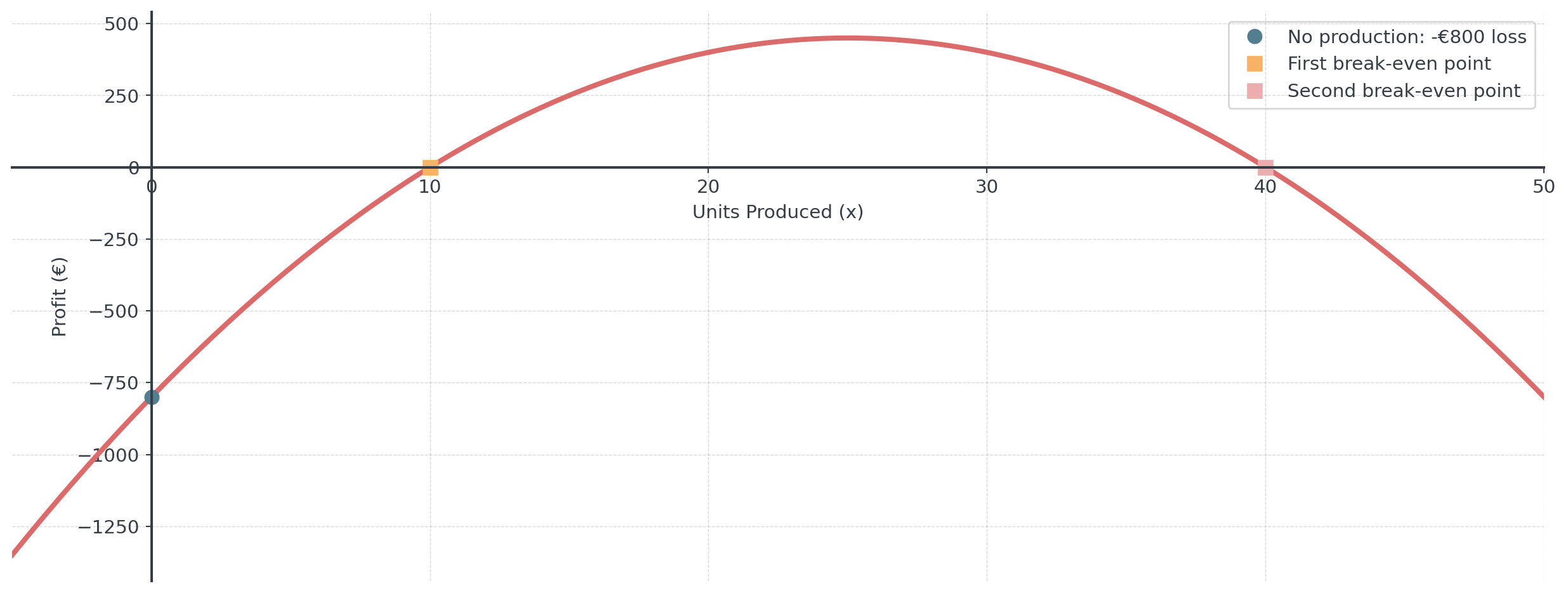 - Optimal price: \(p^* = -\frac{1000}{2(-20)} = \frac{1000}{40} = 25\) euros