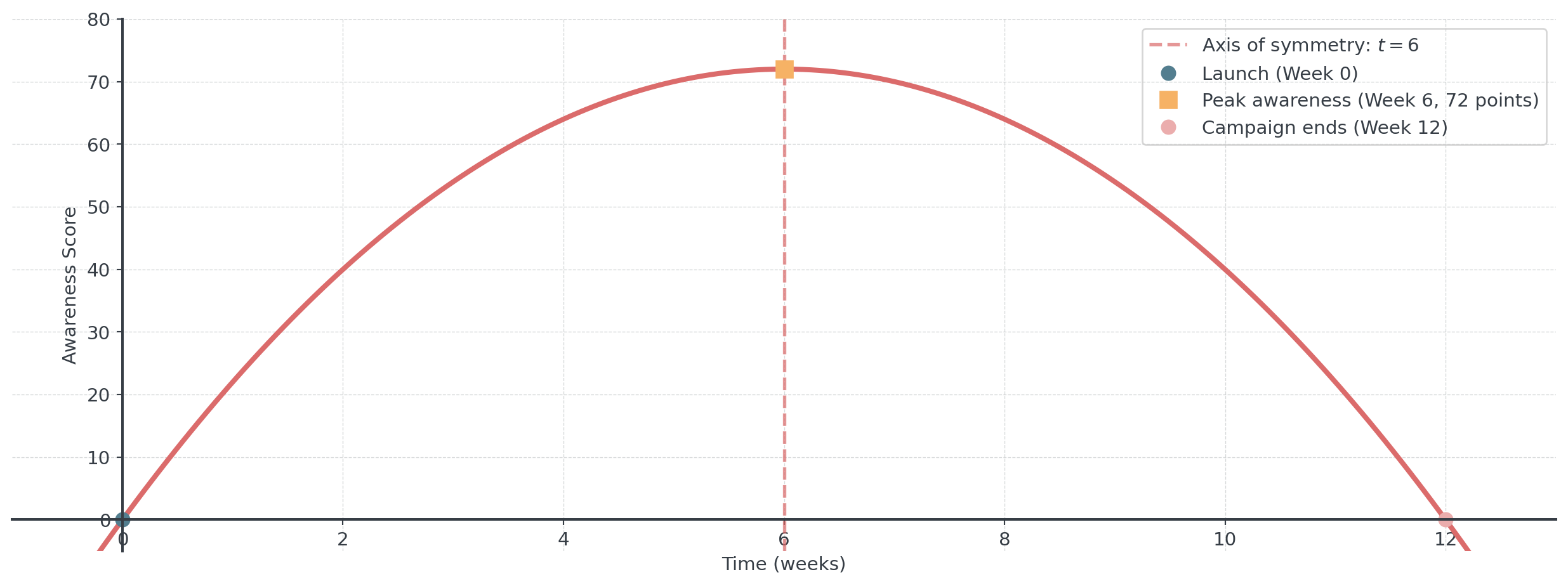 \[A(t) = -2t^2 + 24t\] where \(A\) is awareness score and \(t\) is weeks after launch.