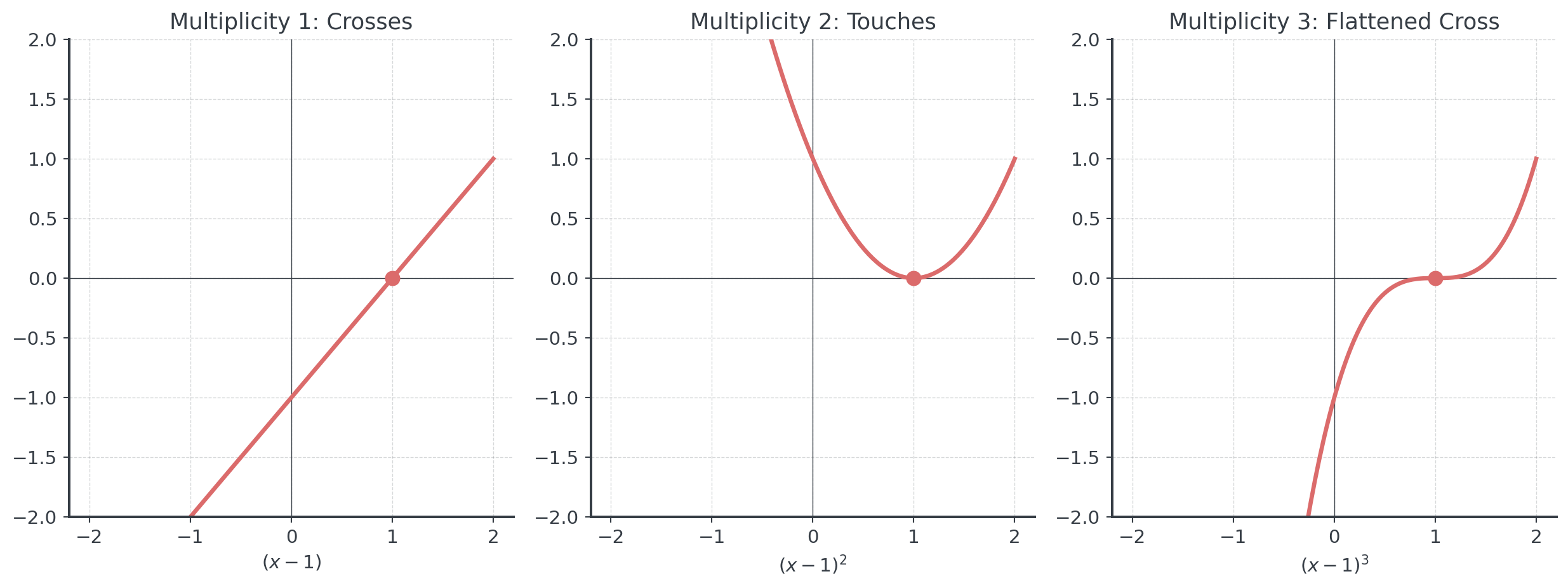 “If \((x - 2)^4\) is a factor, the graph crosses the x-axis at \(x = 2\)”