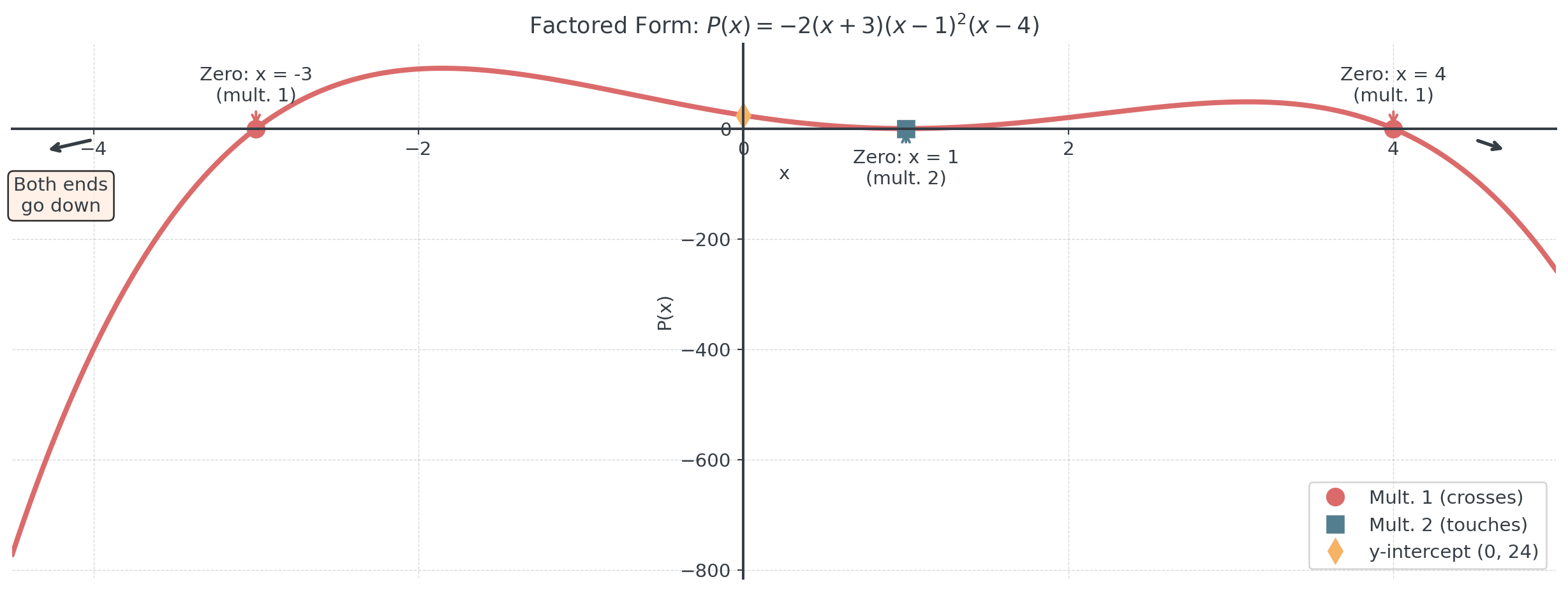 Between zeros, the polynomial doesn’t cross the x-axis. Use test points to determine if the graph is above or below the x-axis in each interval.