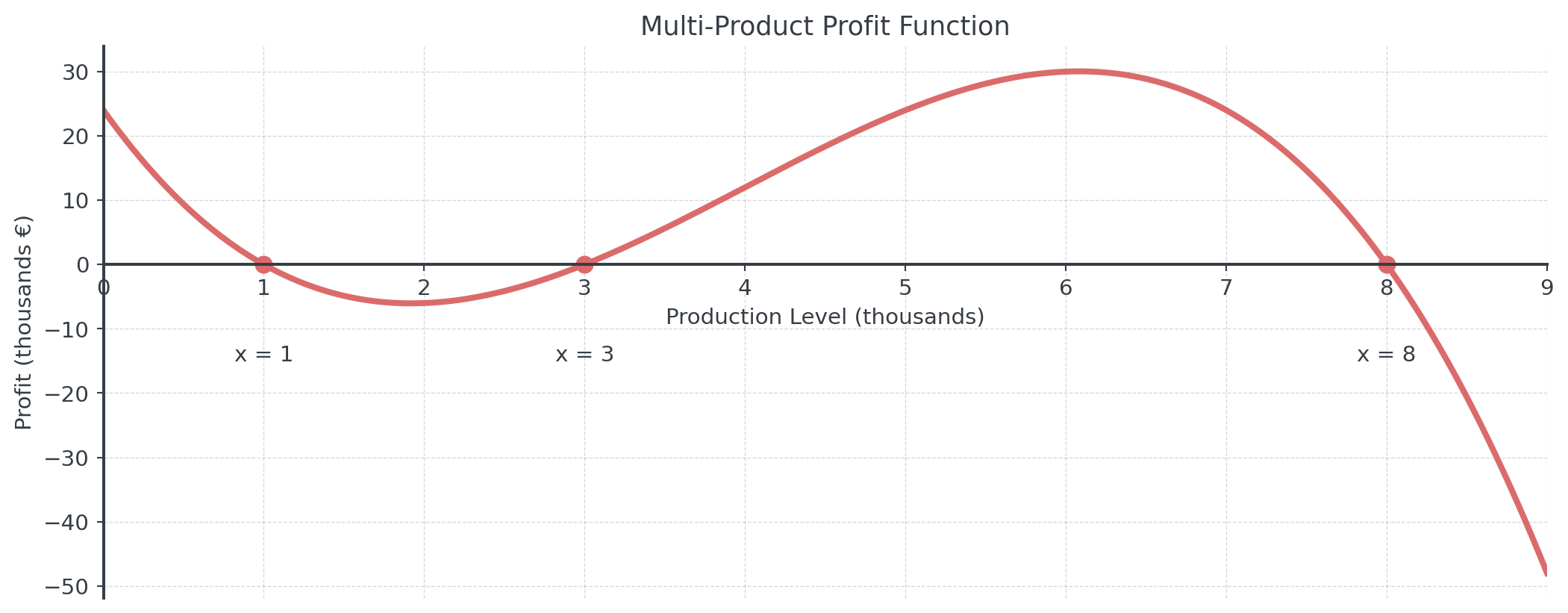 If this represents a company’s profit (in thousands €) where \(x\) is production in thousands of units, at what production levels does the company break even?