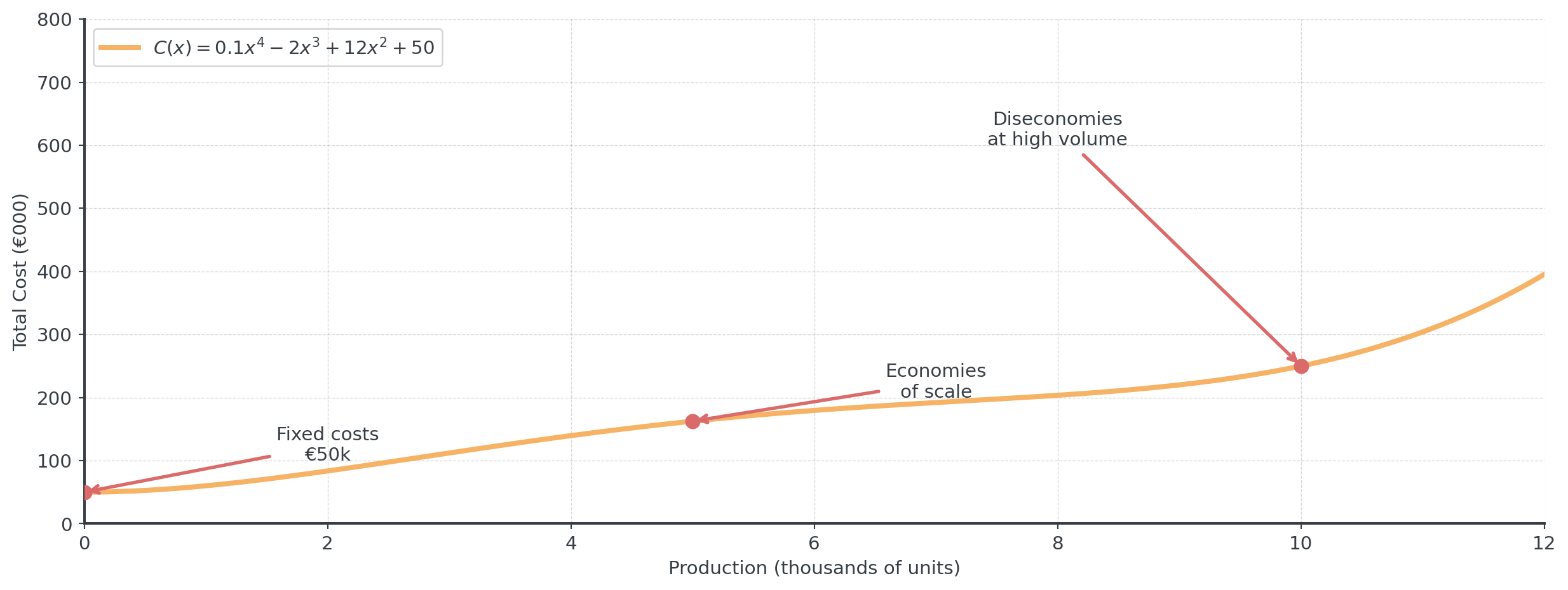 Polynomial cost functions capture the reality that unit costs often decrease initially (economies of scale) but may increase at very high production levels (capacity constraints).