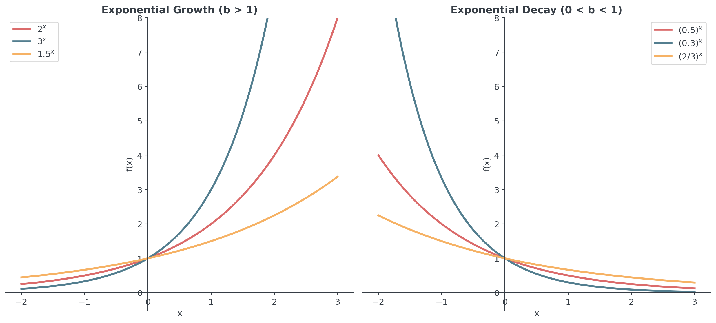 Exponential Functions: \(f(x) = a^x\) → fixed base, variable exponent