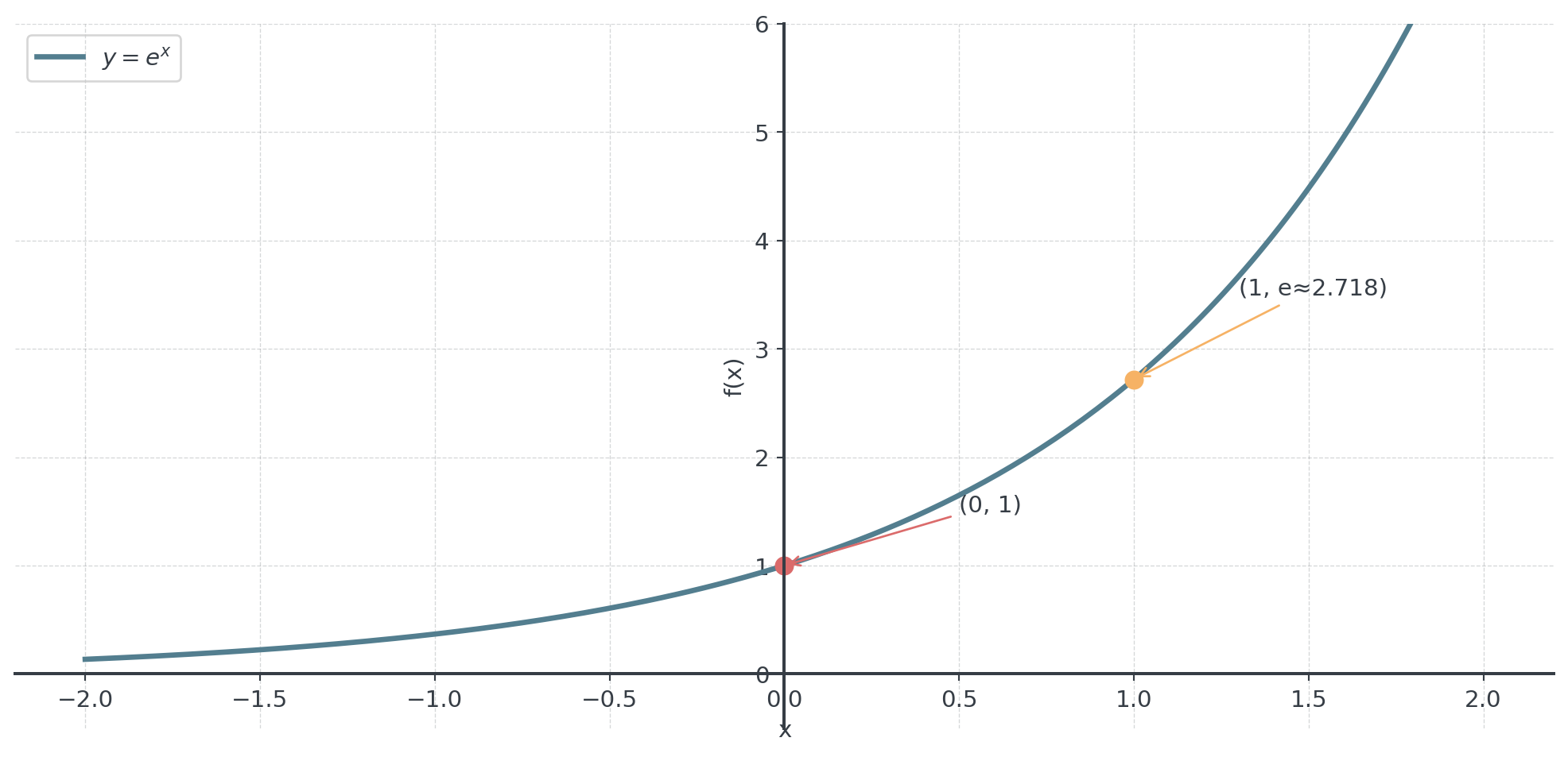 Always positive, passes through \((0, 1)\), grows faster as \(x\) increases