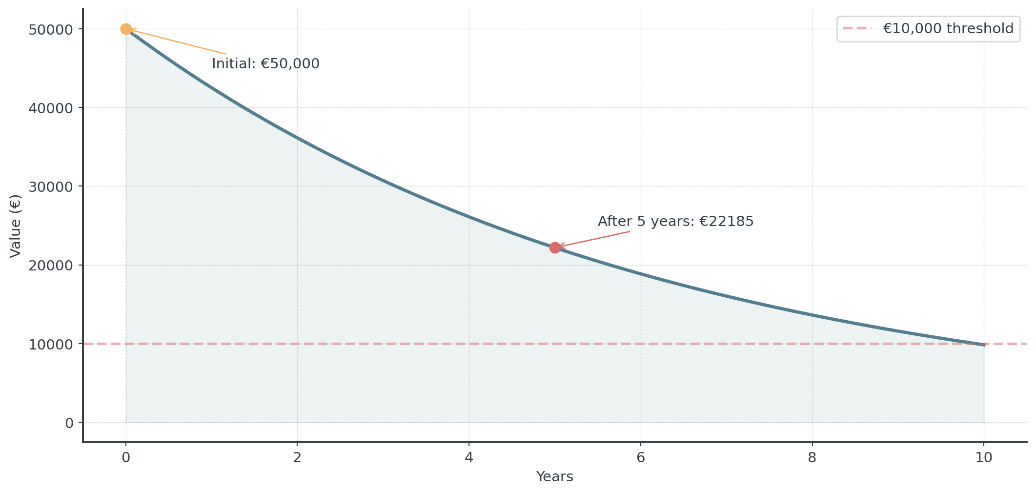 Model: \(V(t) = 50000 \cdot 0.85^t\)