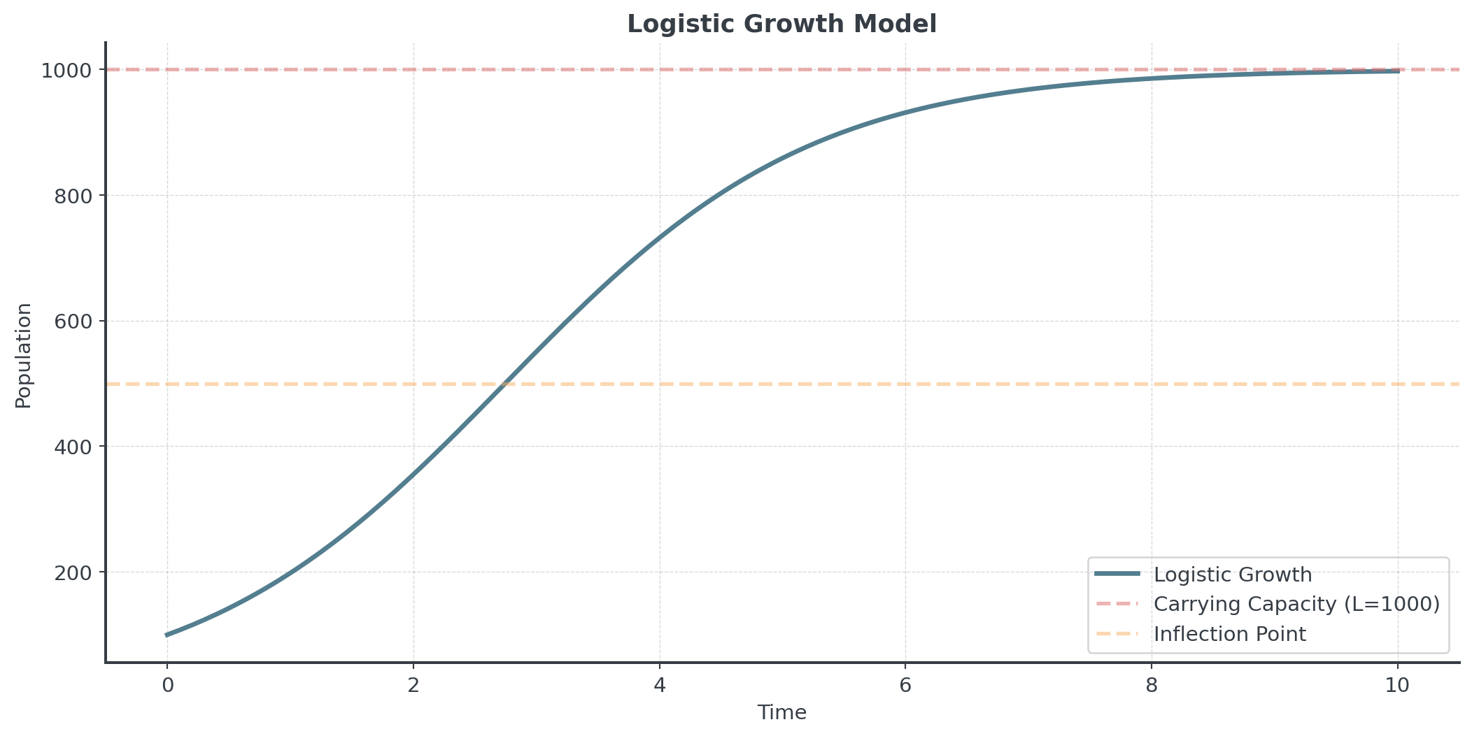 - Population reaches \(\frac{L}{2}\) (inflection point)