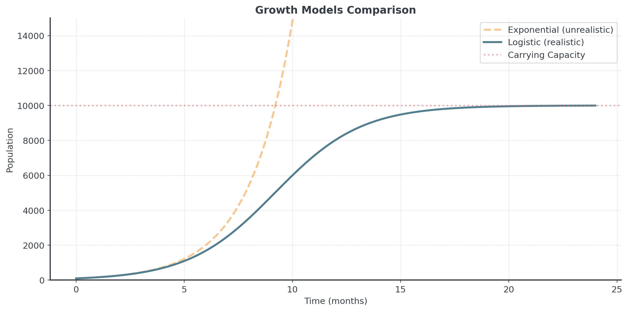 Unlike pure exponential growth (which is unsustainable), logistic growth is realistic. Every real system has limits!