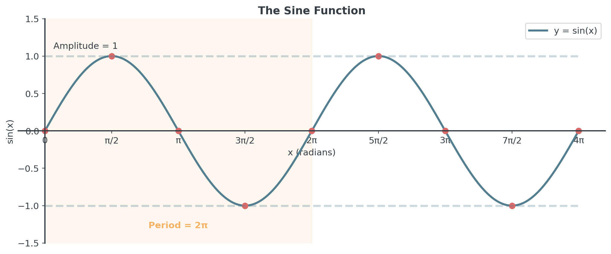 Trigonometry introduces periodic (repeating) behavior - a new type of function compared to the always-increasing exponentials! Instead of continuous growth, we’ll see cycles and oscillations.