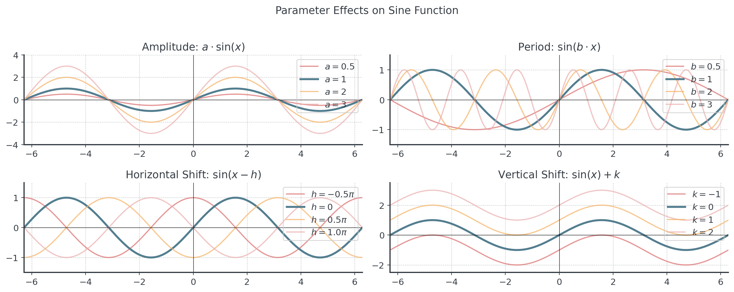 - B: Affects period (Period = 2π/B)