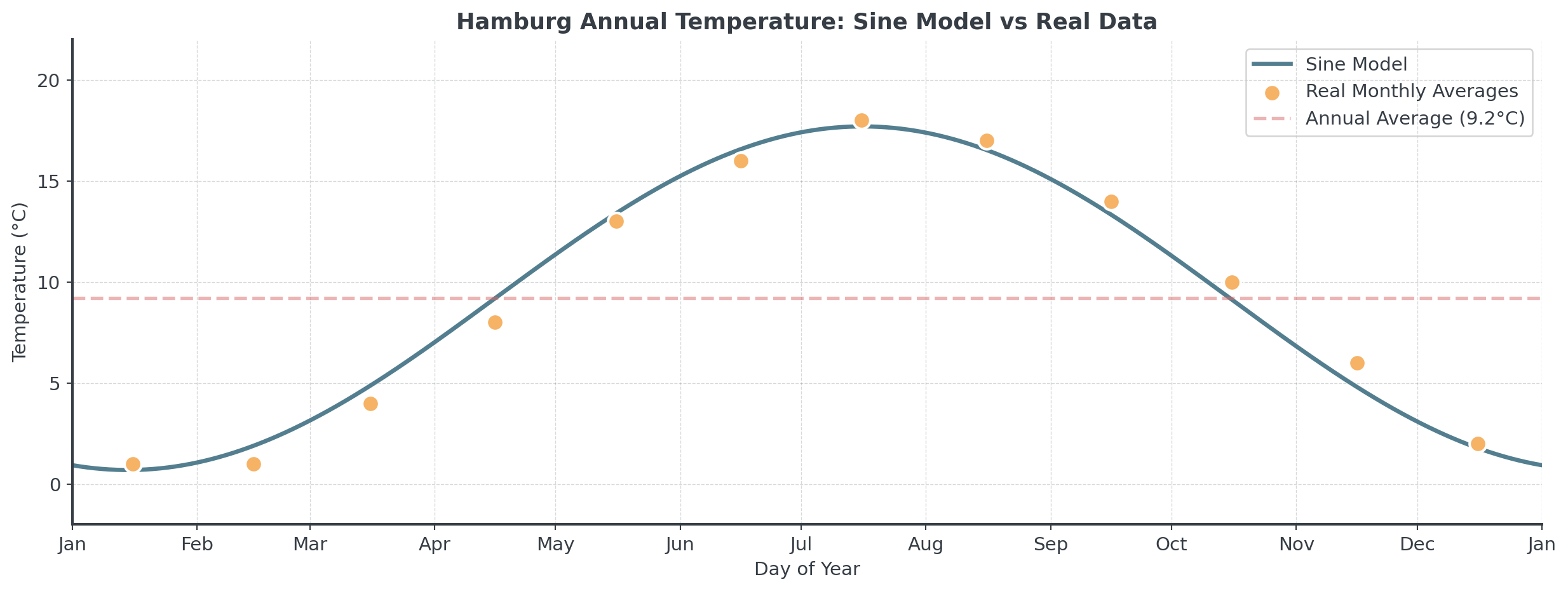 The sine function provides an great fit to Hamburg’s real climate data!