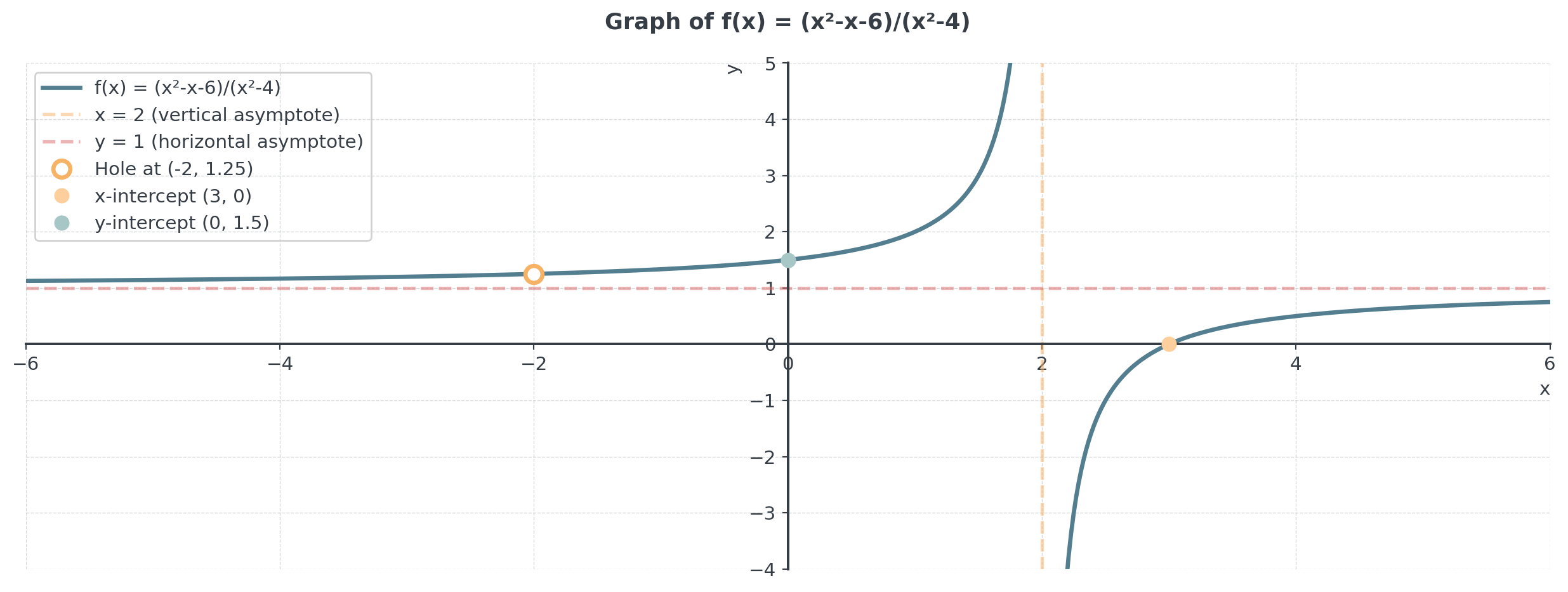 - Analyze rational functions completely (asymptotes, holes, intercepts)