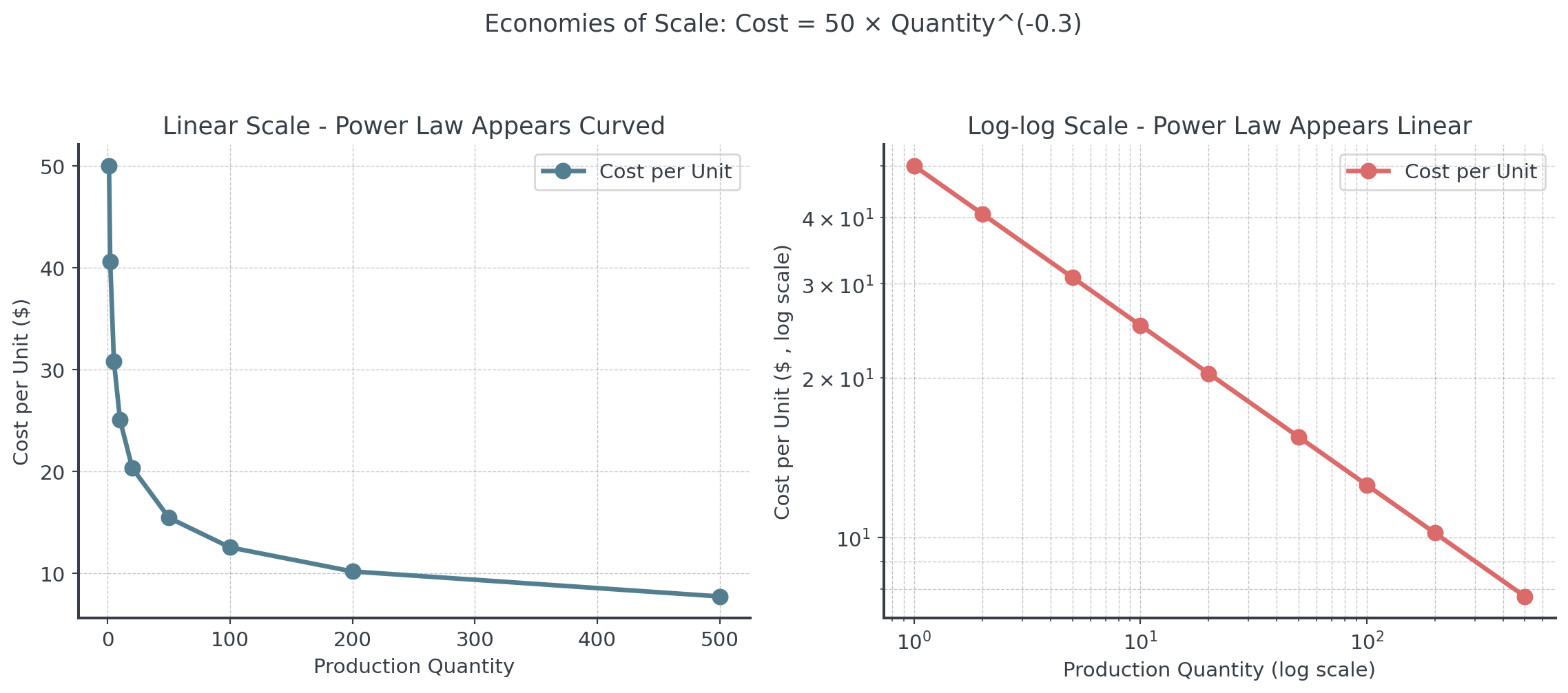 On the log-log plot, the straight line confirms a power law relationship. The slope of -0.3 means that doubling production reduces per-unit cost by about 19% (2^(-0.3) ≈ 0.81).