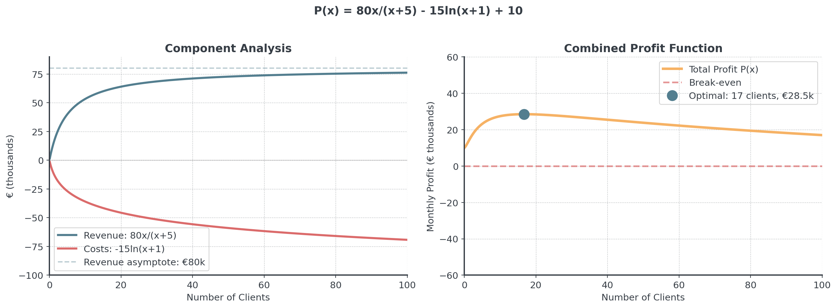- Rational term \(\frac{80x}{x+5}\): Revenue per client (approaches €80k asymptote)