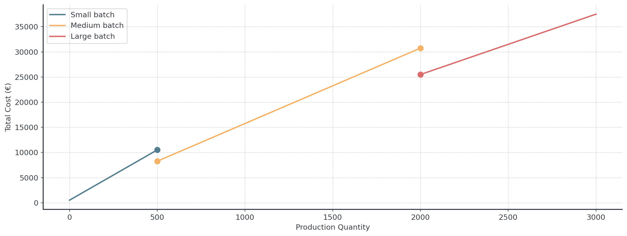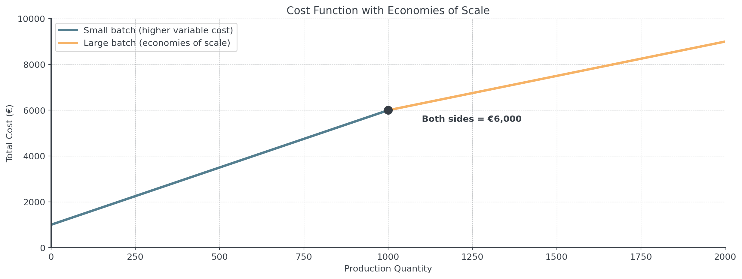 - Small batches (< 500 units): \(C_1(x) = 20x + 500\)
