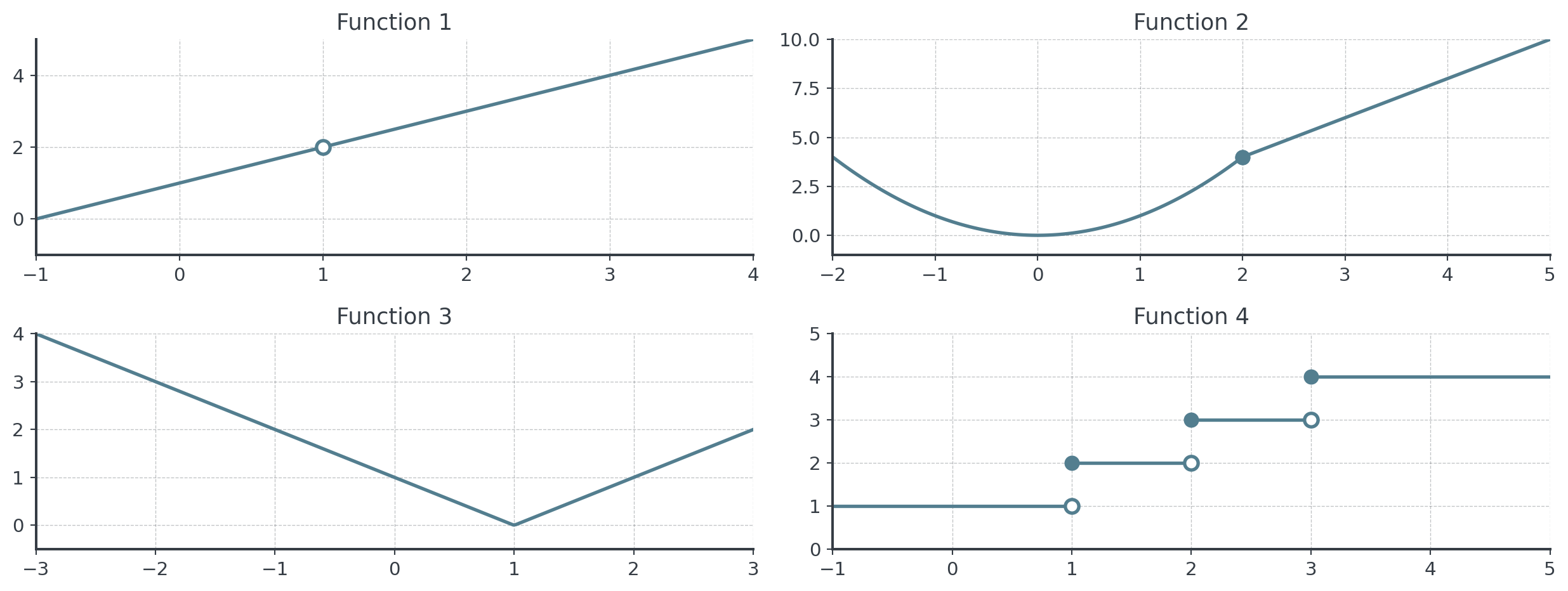 - Function 4: Does \(\lim_{x \to 2} f(x)\) exist?