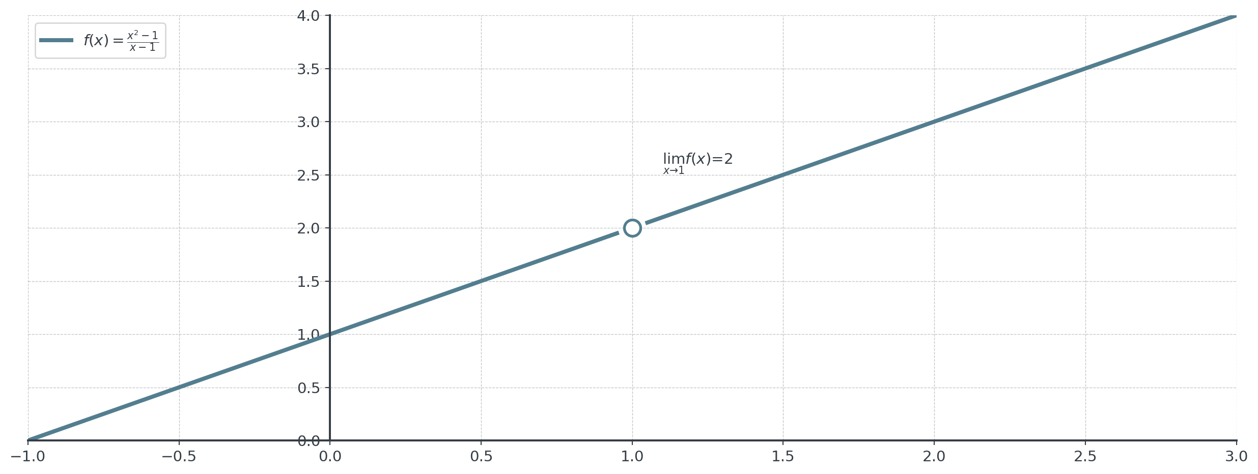 \(\lim_{x \to 1} f(x) = 2\) (even though \(f(1)\) is undefined)