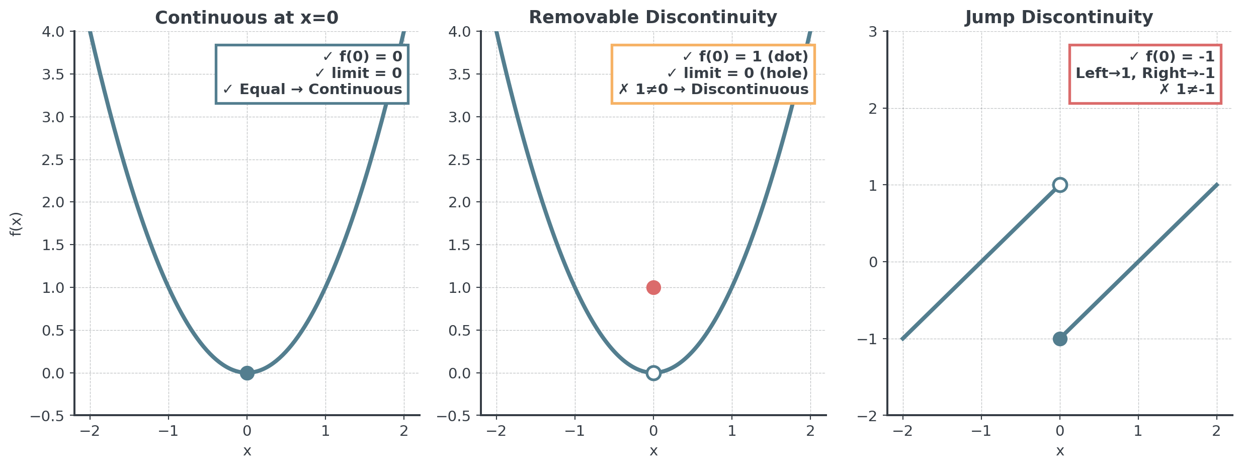 - \(\lim_{x \to a} f(x) = f(a)\) (limit equals the function value)