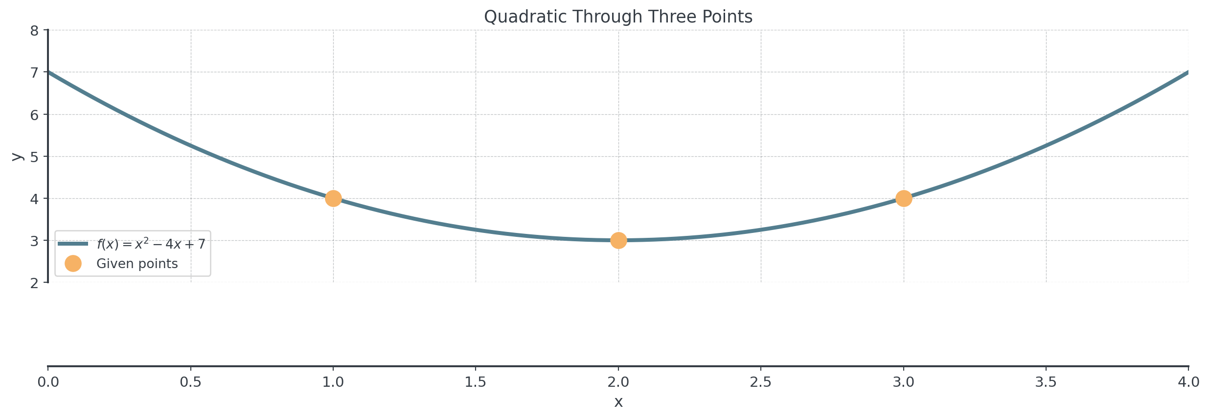 Check: Does \(f(x) = x^2 - 4x + 7\) pass through all three points?