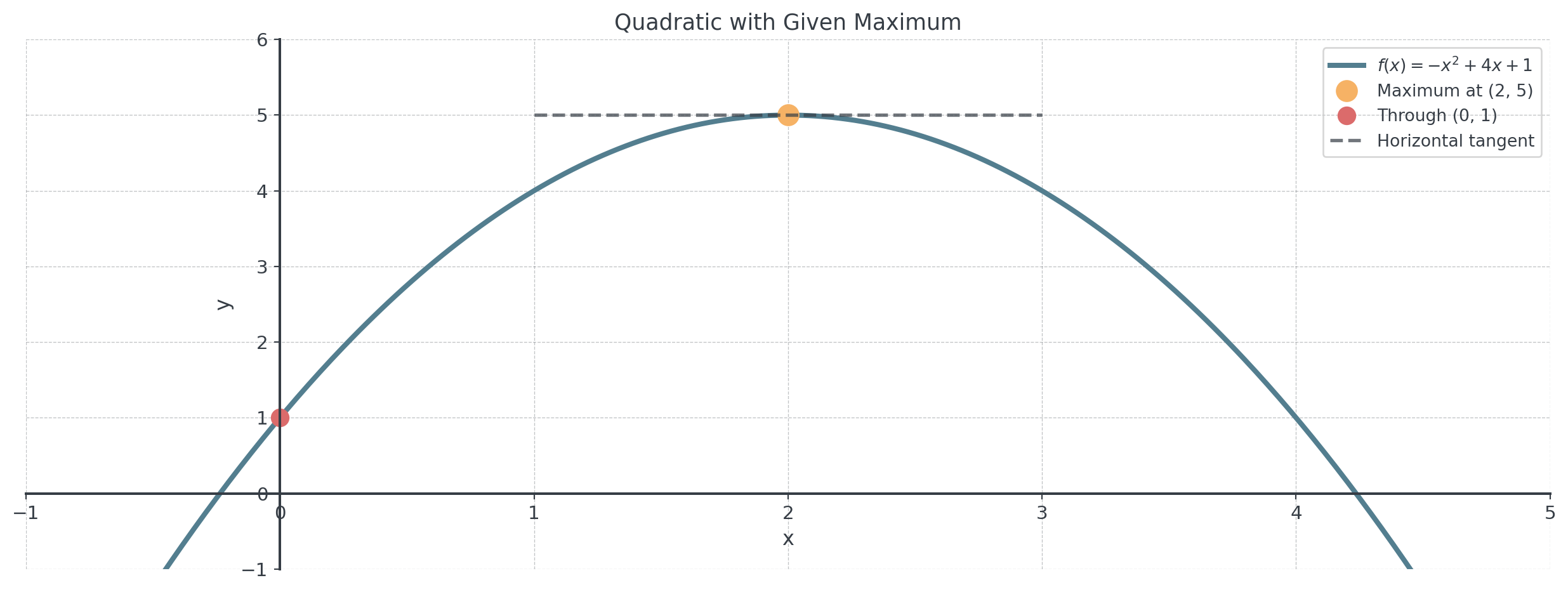 Problem: Find the quadratic function with a maximum at \((2, 5)\) that passes through \((0, 1)\).