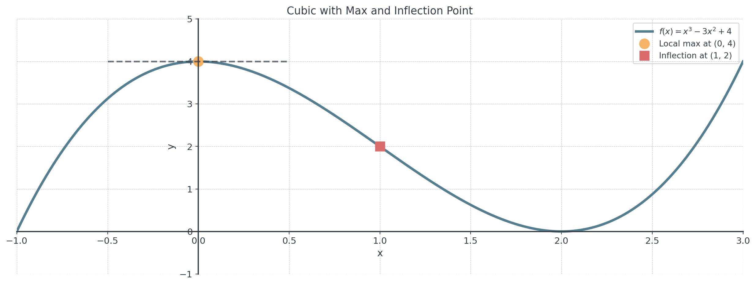 - Horizontal tangent at max: \(f'(2) = 0\)