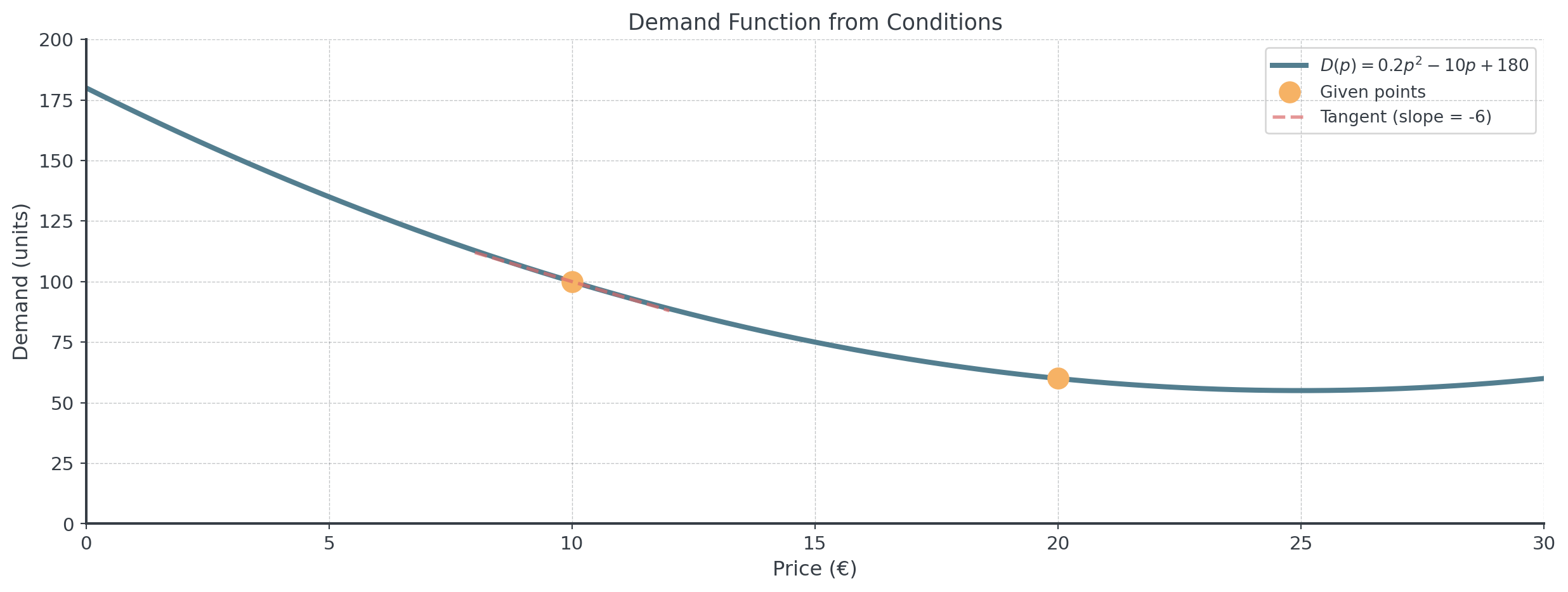- At price €10, demand is 100 units: \(D(10) = 100\)