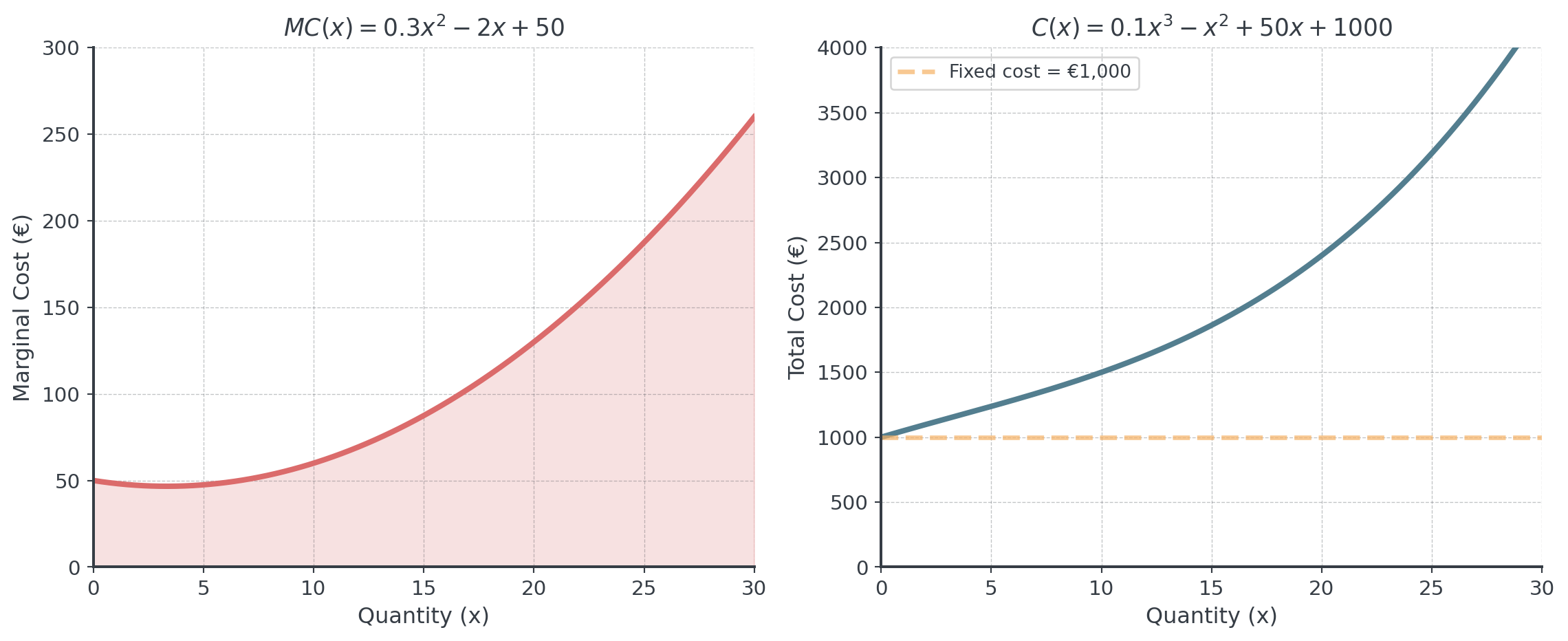A company’s marginal cost is \(MC(x) = 20 + 0.4x\) euros per unit. Fixed costs are €500. Find the total cost function \(C(x)\) and calculate the total cost of producing 50 units.