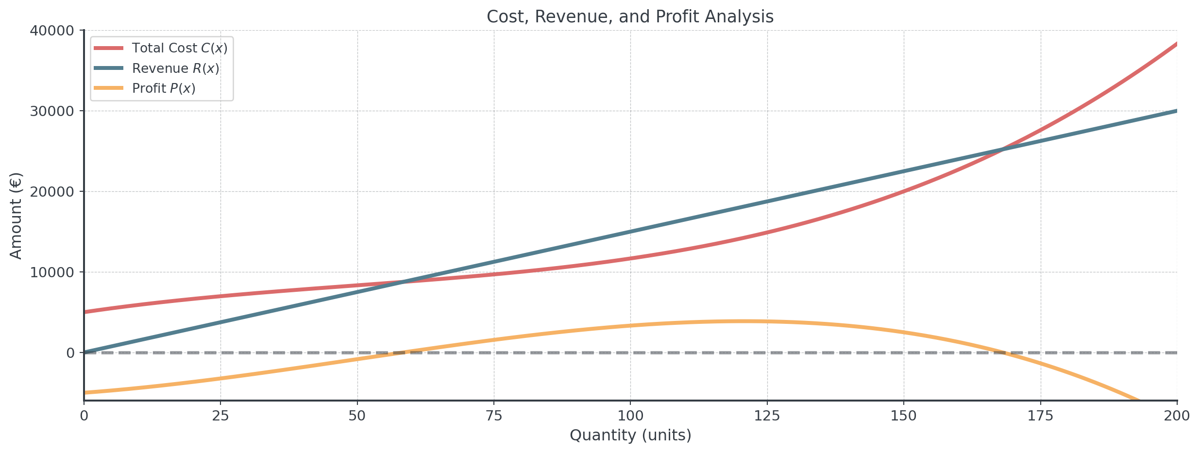 - Marginal cost: \(MC(x) = 0.02x^2 - 2x + 100\) euros per unit