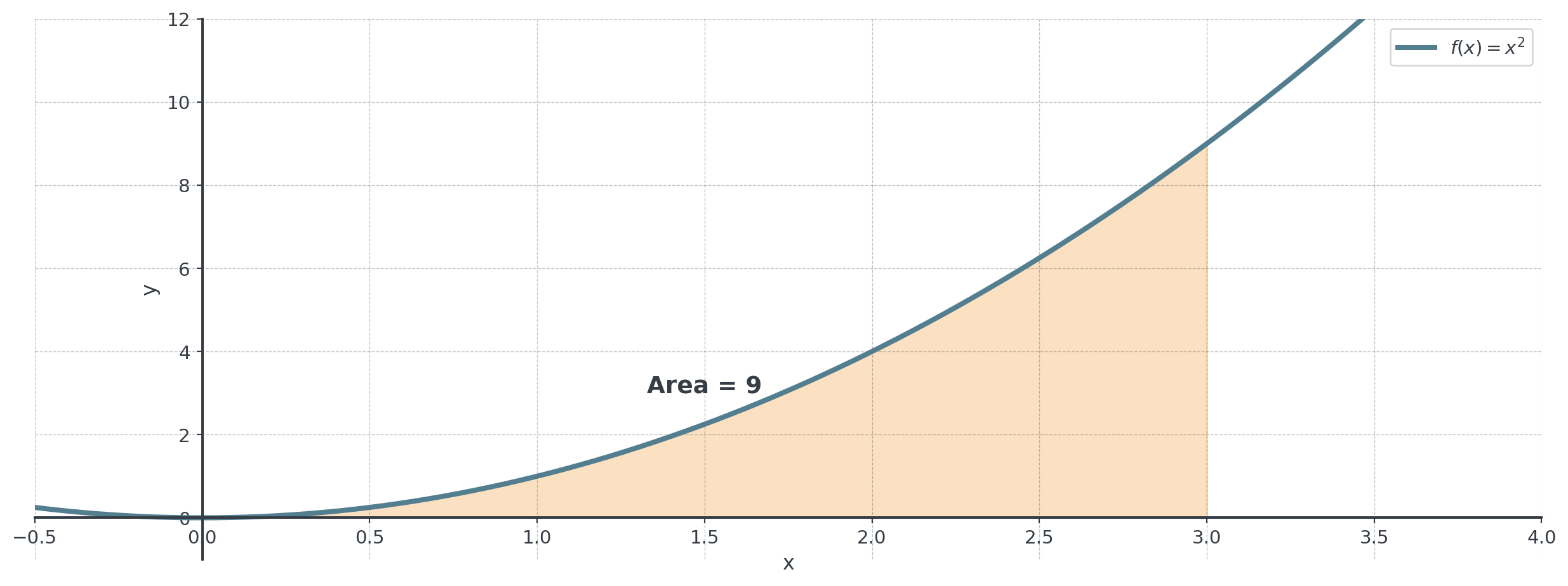 \[\text{Area} = \int_0^3 x^2 \, dx = \frac{x^3}{3} \Big|_0^3 = \frac{27}{3} - 0 = 9\]