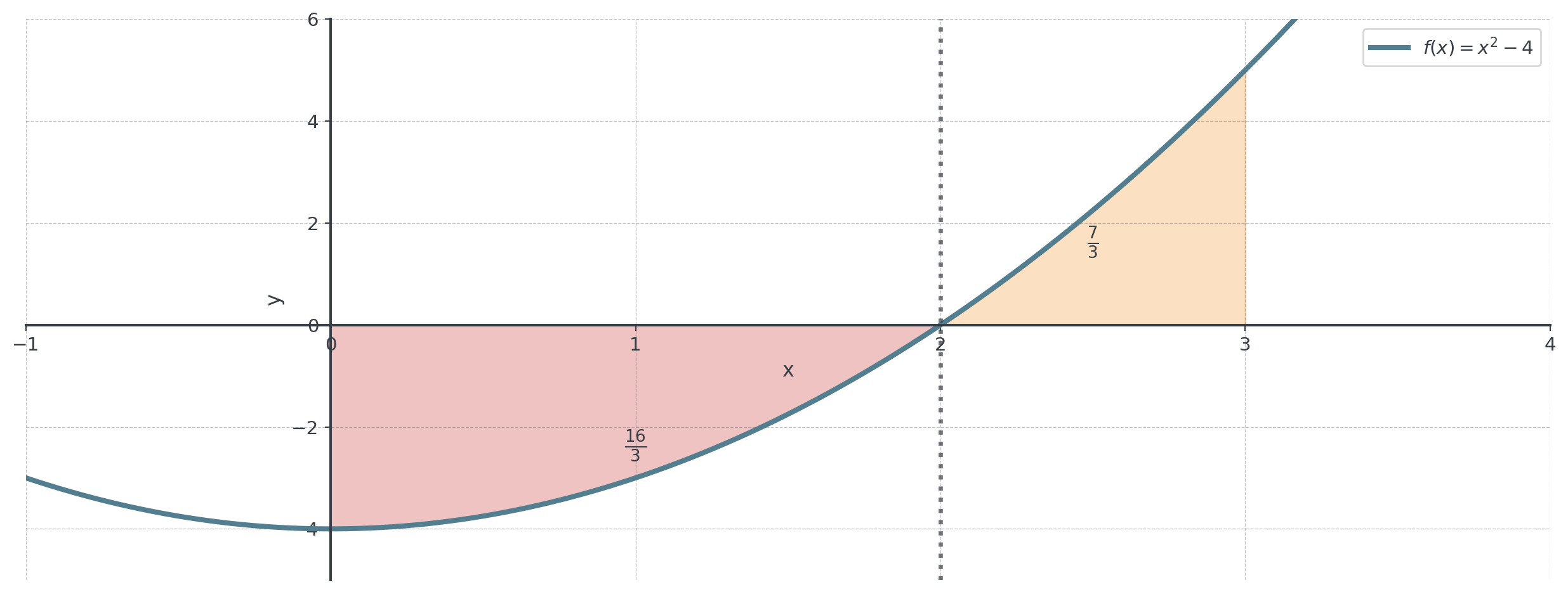 \[\int_2^3 (x^2 - 4) \, dx = \left[\frac{x^3}{3} - 4x\right]_2^3 = (9 - 12) - (\frac{8}{3} - 8) = -3 + \frac{16}{3} = \frac{7}{3}\]