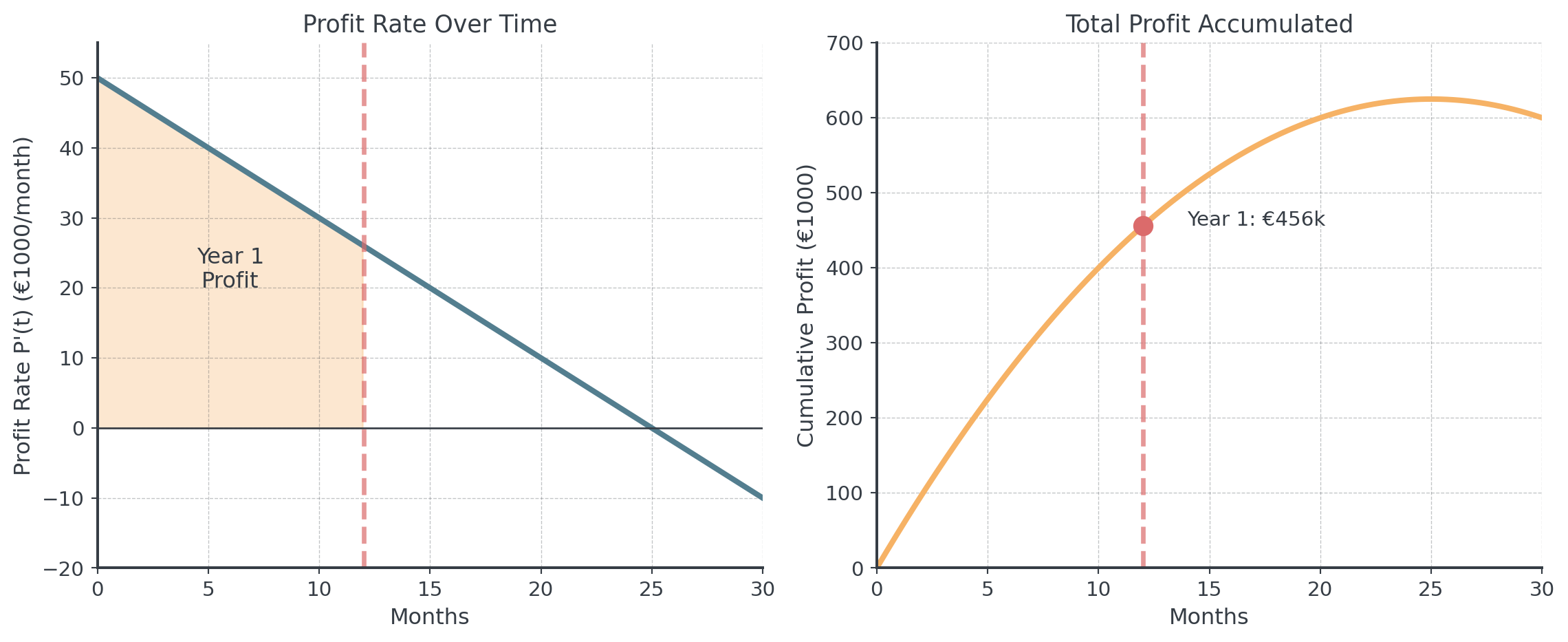 - What is the total profit during the first year (\(t = 0\) to \(t = 12\))?