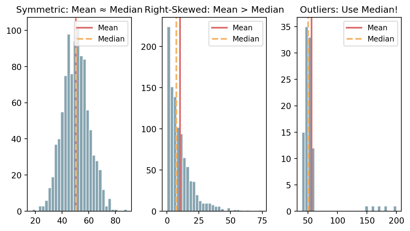 Mean: Best for symmetric data without outliers; Median: Best for skewed data or data with outliers; Mode: Best for categorical data