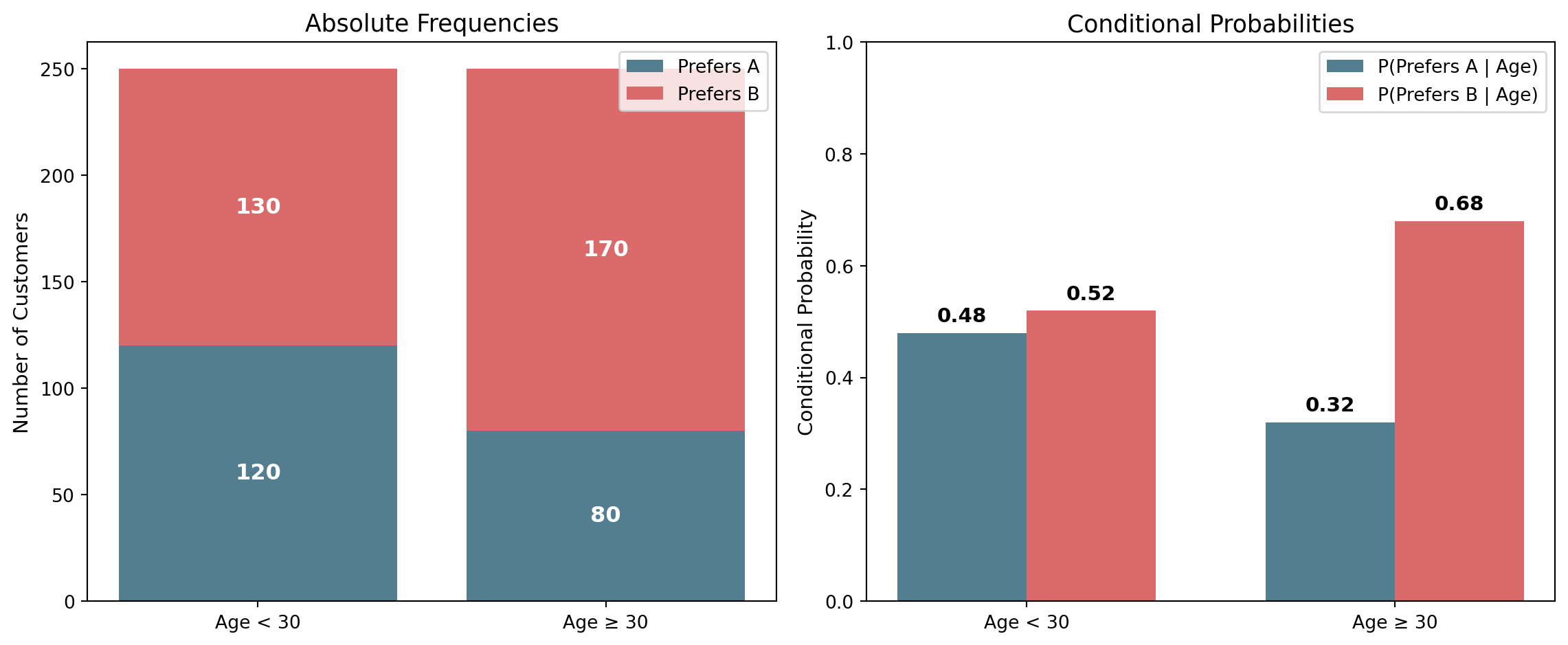 - \(P(\text{Prefers A} | \text{Age} < 30) = \frac{120}{250} = 0.48\) (conditional)