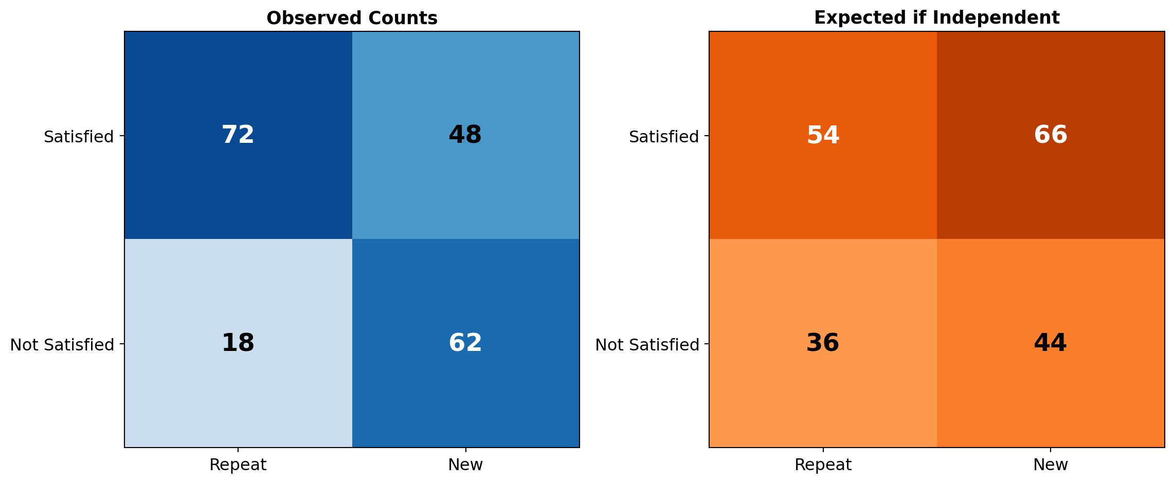 \(P(\text{Repeat}|\text{Satisfied}) = 0.60\), so \(72\) repeat AND satisfied