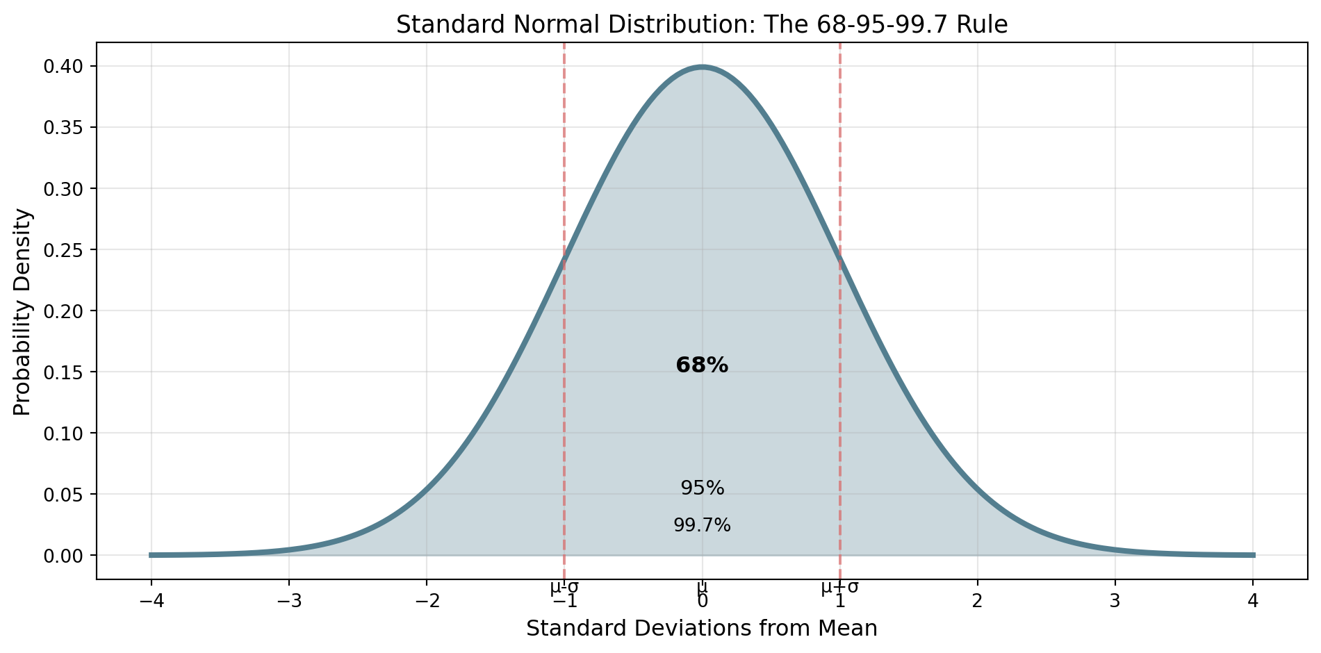 For normal distributions: - 68% of data falls within \(\mu \pm 1\sigma\) - 95% of data falls within \(\mu \pm 2\sigma\) - 99.7% of data falls within \(\mu \pm 3\sigma\)